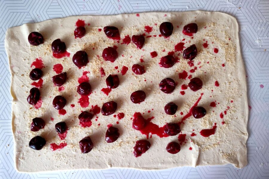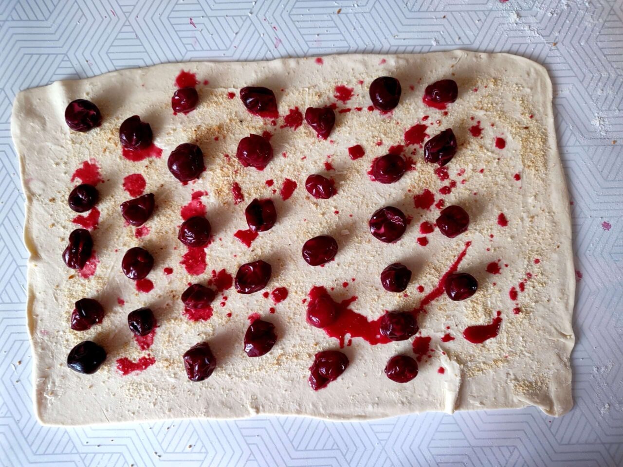 - Смазать тесто размягченным сливочным маслом, присыпать панировочными сухарями. Разложить вишню, равномерно распределить ее по раскатанному пласту.