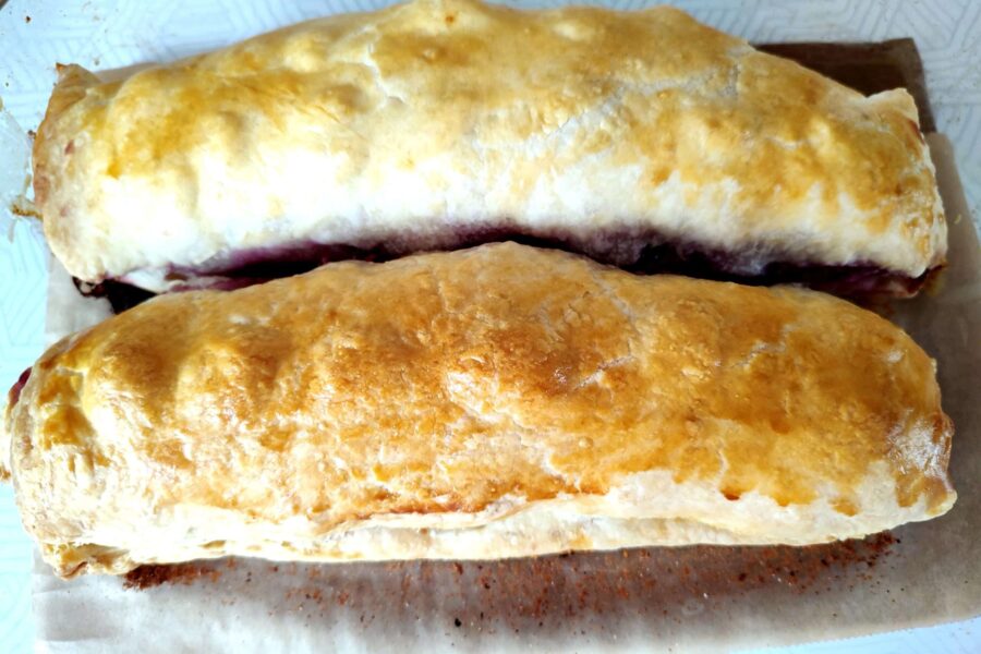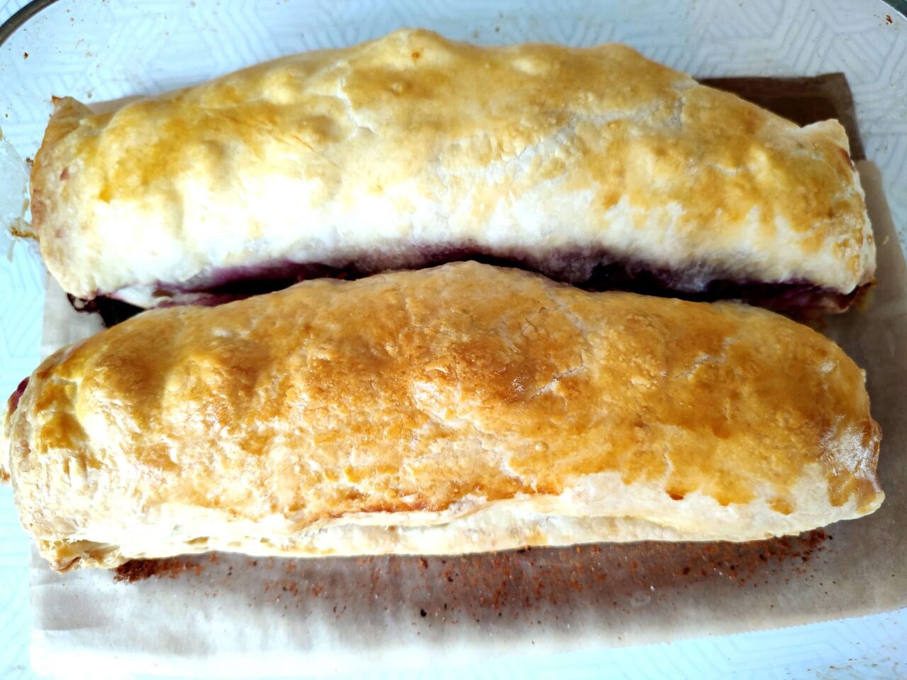 - По готовности достать штрудель и дать ему немного остыть. Нарезать готовую выпечку на порции и посыпать сахарной пудрой. Можно подать со взбитыми сливками или шариком мороженого.
