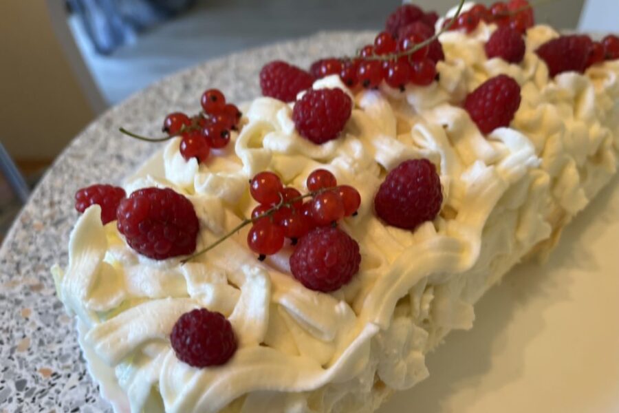 - Tăiati părțile laterale ale ruladei de bezea. Și începeti să decorati. Folositi o seringă de patiserie pentru a face valuri din cremă. Decorati blatul cu zmeura si ramuri de coacaze.