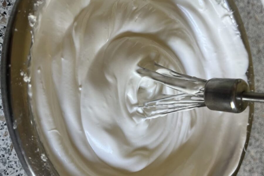 - Bezeaua trebuie să fie densă, dar aerisită. Pentru a verifica, întoarceți vasul pentru a vă asigura că nu curge pe părțile laterale. Adăugați 2 linguri de amidon și amestecați încă un minut, astfel încât amidonul să fie uniform combinat cu restul masei. Tapetati o foaie de copt cu pergament și răspânditi uniform bezeaua pe tava.