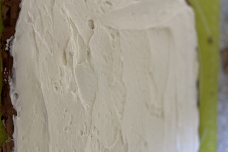 - Scoateti tava din cuptor si il intorceti pe un covor de silicon. Il lasati pana se raceste complet. Intre timp pregatiti crema. Se amestecă smântâna, mascarpone și zahărul pudră cu un mixer timp de aproximativ 5-7 minute. Crema este gata, pune-o la frigider.