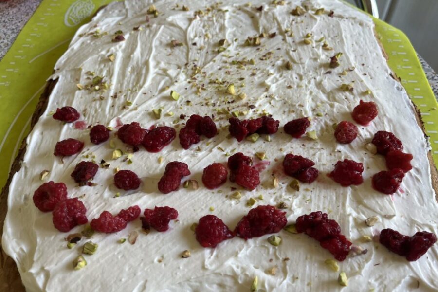 Rulada de bezea cu zmeura si fistic este un desert ce impresioneaza prin contrastul dintre bezeaua crocanta si crema fina, dulce-acrisora, aromata cu zmeura proaspata. Fisticul adauga textura si un gust usor sarat ce echilibreaza dulcele. Prepararea incepe cu batut bezeaua spumoasa, se coace lent si se raceste complet, apoi se umple cu crema de mascarpone si smantana, se decoreaza cu zmeura si fistic. Perfecta cand vrei sa aduci un desert special fara complicatii majore.