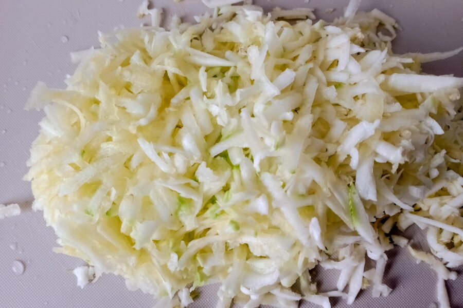 - Curatati dovlecelul si dati-l pe o razatoare grosiera. Presarati sare, amestecati si lasati sa stea cateva minute. Dovlecelul trebuie sa elibereze lichid.