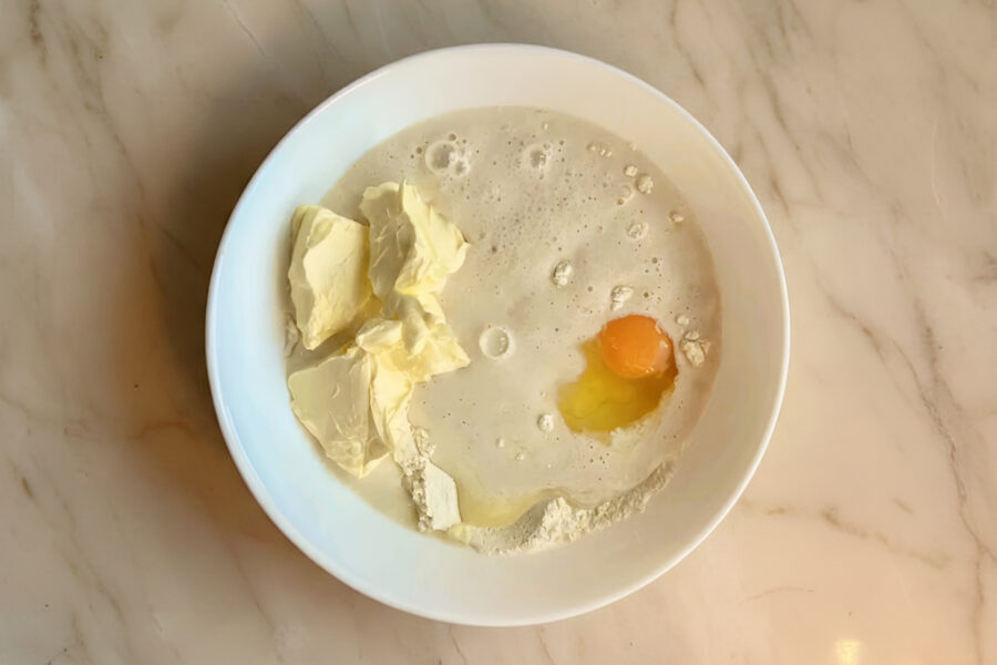 - Adaugati in bolul cu faina amestecul de drojdie cu lapte, un ou si untul moale.