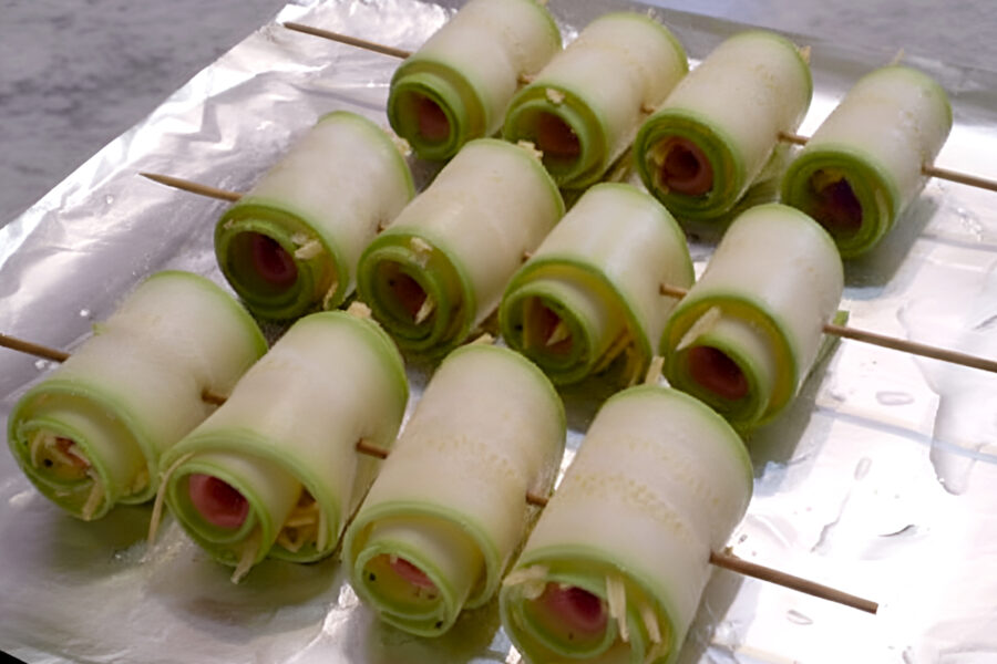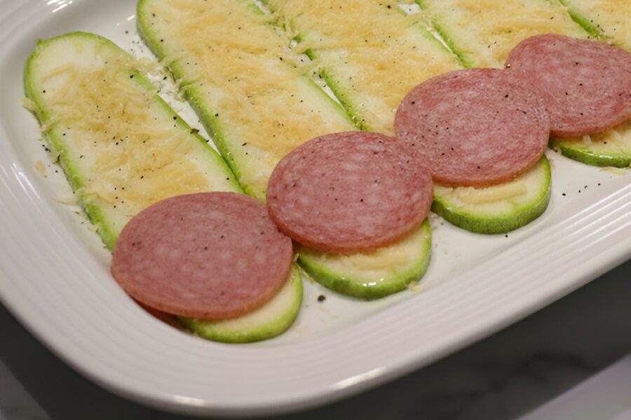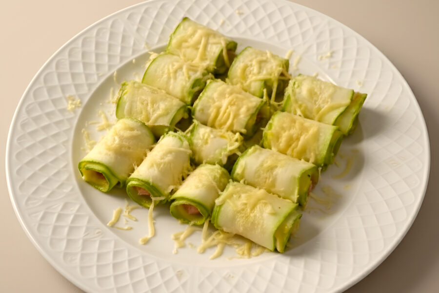 Umplutura se bazeaza pe cascaval ras, care se topeste la cuptor si leaga frumos ruloul, si felii de salam care adauga gust intens si textura. Intai condimentezi dovleceii cu sare si piper, apoi presari cascavalul, iar la unul dintre capete asezi cate o felie de salam. De aici rulezi strans, astfel incat umplutura sa ramana la interior si sa nu curga in timpul coacerii.