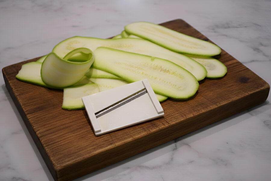 Dovlecelul se spala bine, se indeparteaza capetele, apoi se taie in felii foarte subtiri pe lungime. Este important sa obtii fasii de grosime aproximativ egala, pentru ca toate rulourile sa se coaca uniform si sa aiba aceeasi textura. Daca ai o mandolina, foloseste‑o pentru a grabi procesul si a obtine felii perfect regulate, usor de rulat.
