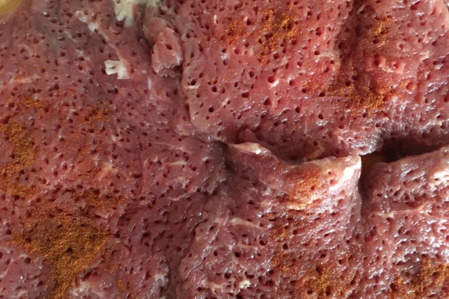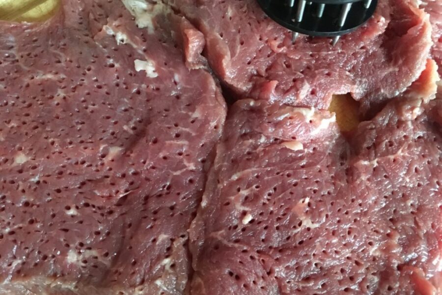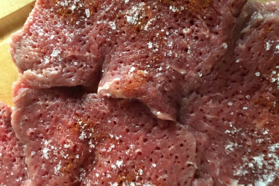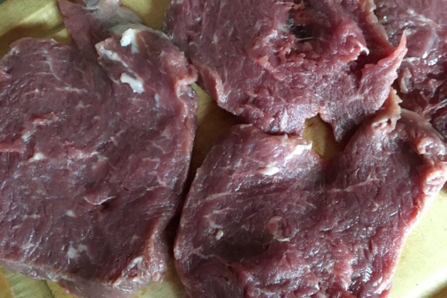 - Tăiați carnea în plăci alungite. Grosimea aproximativă – 3 cm. Spălați-le.