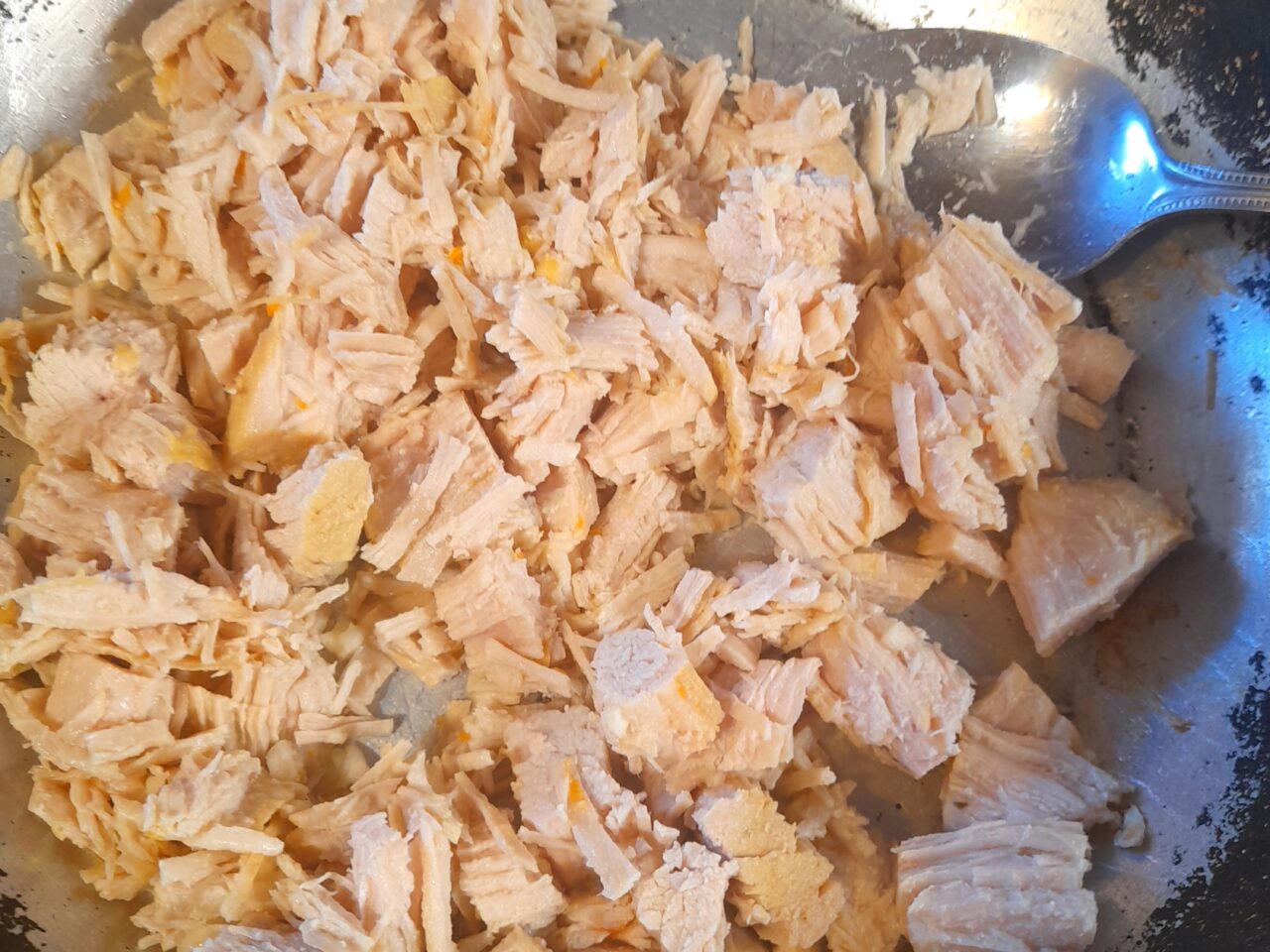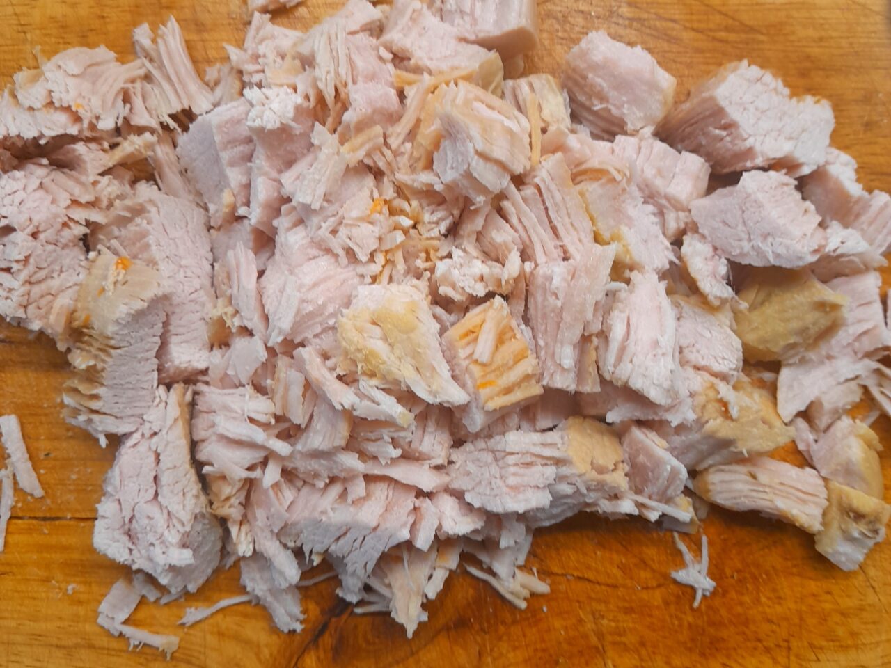 - Pregătiți toate ingredientele necesare. Tăiați curcanul fiert în bucăți mici.