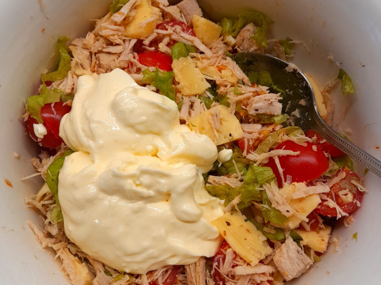 - Pregătiți dressingul. Se amestecă maioneza și usturoiul tocat într-un bol separat.