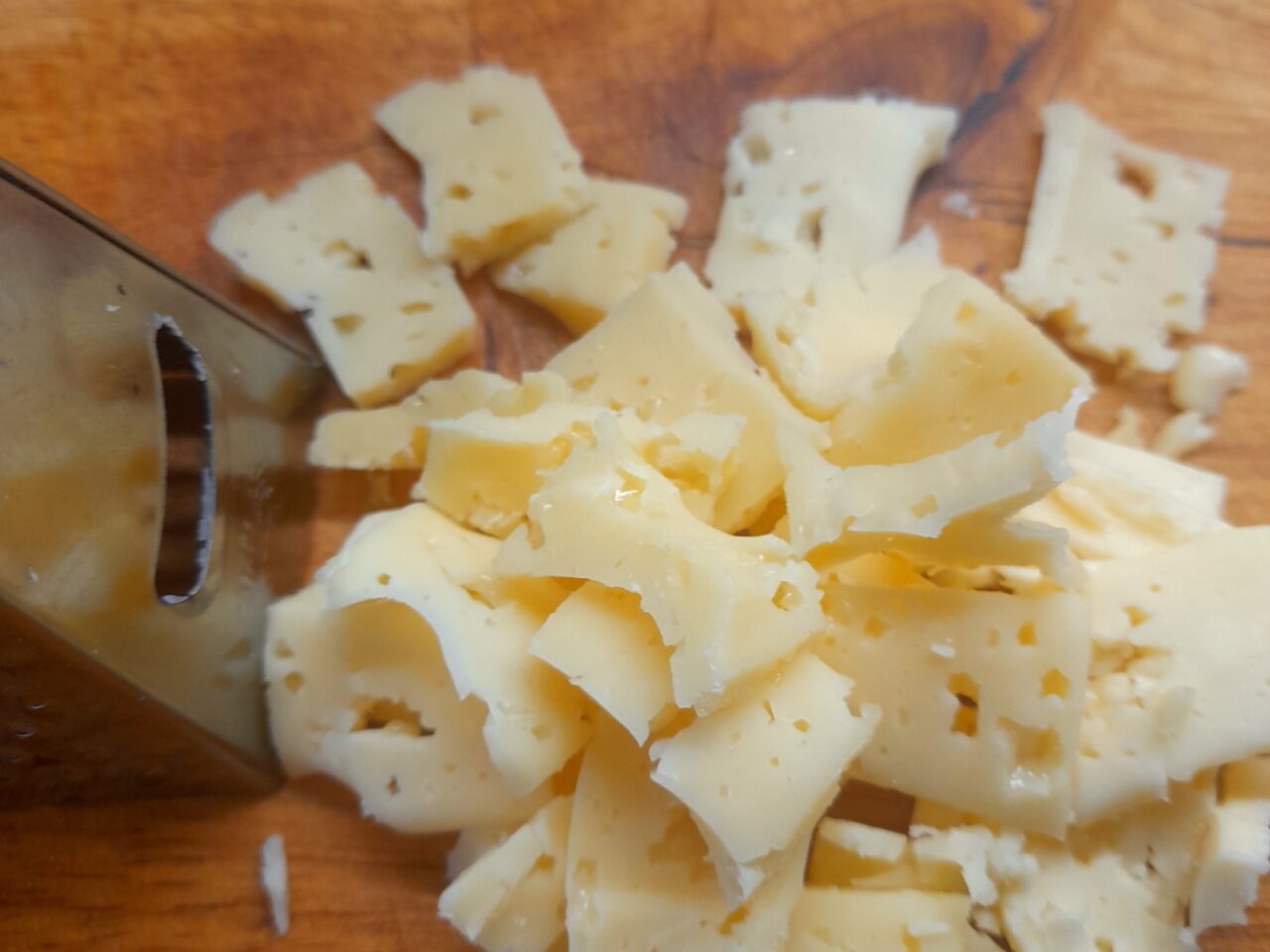 - Se taie felii subțiri sau se rade cașcavalul tare.