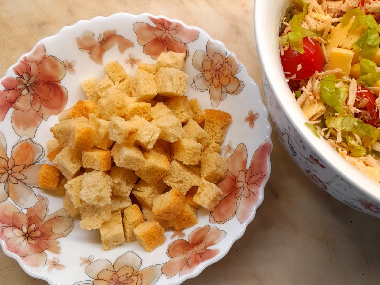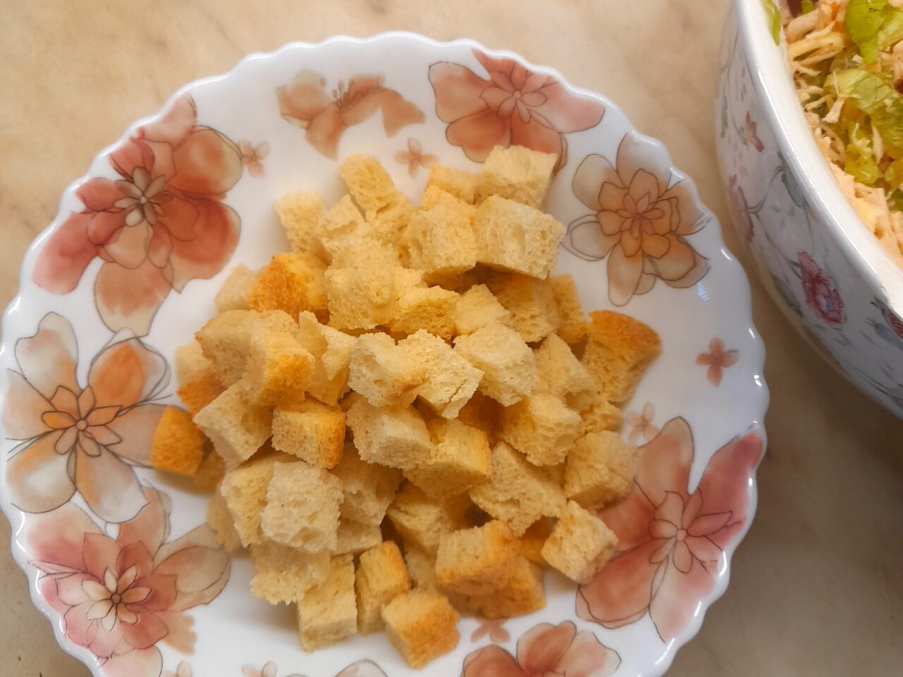 - Se prepară pesmetul. Tăiați pâinea albă în cuburi. Puneți-o pe o tavă de copt unsă cu ulei vegetal. Se introduce în cuptorul preîncălzit la 150°C timp de 10-15 minute.