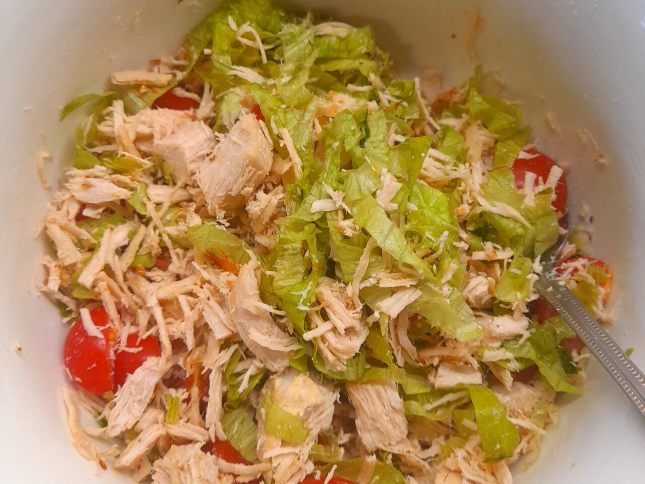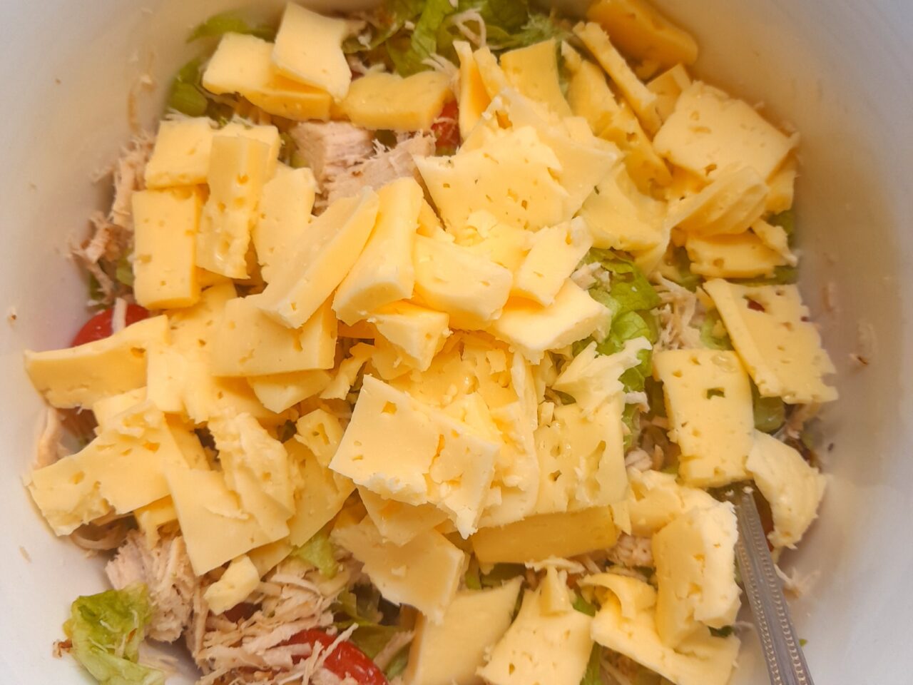 - Puneți toate ingredientele într-un castron adânc (curcan, roșii, frunze de salată).