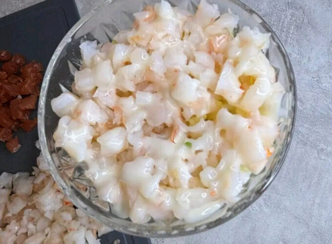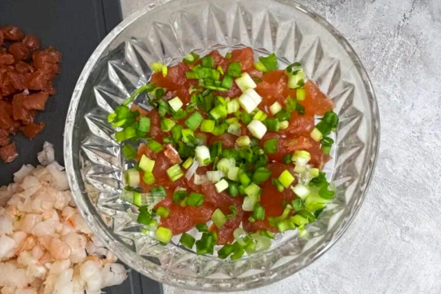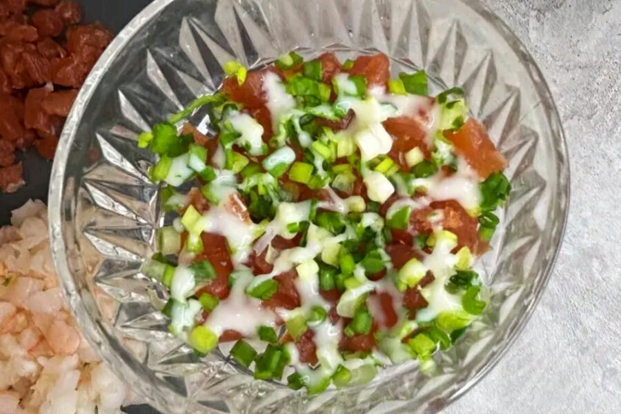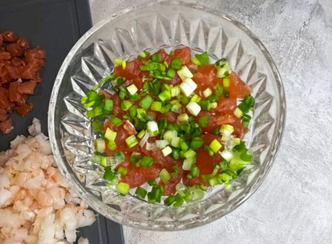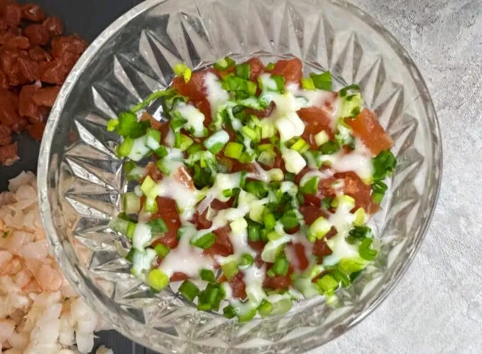 - Primul strat de salata va fi pestele afumat taiat cubulete, iar deasupra presarati ceapa verde taiata marunt.