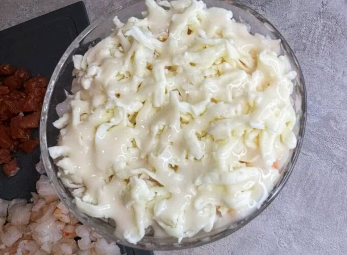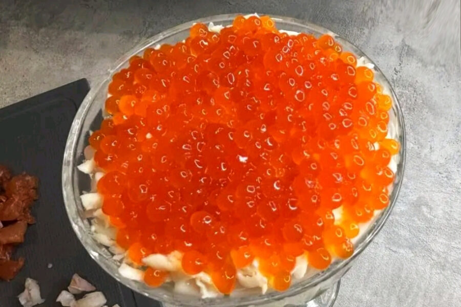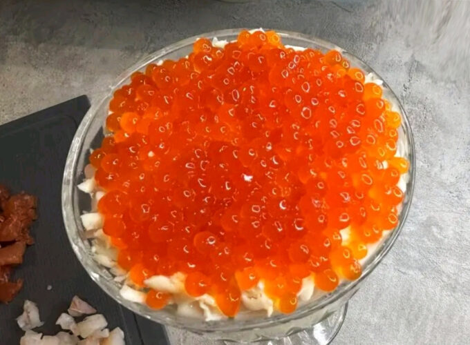 Reteta gustoasa de salata cu creveti, caviar rosu, peste afumat si cascaval la pahar. Aceasta salata se potriveste perfect pentru o masa de sarbatoare.