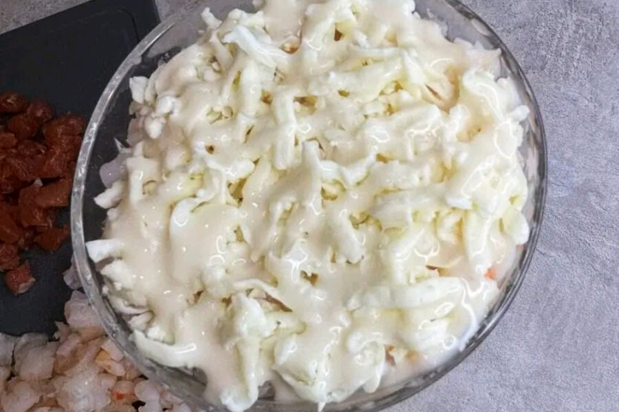 - Taiati marunt crevetii fierti si puneti-i pe urmatorul strat. Ungeti cu maioneza.