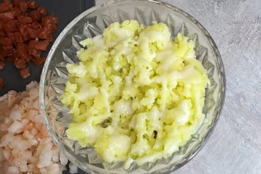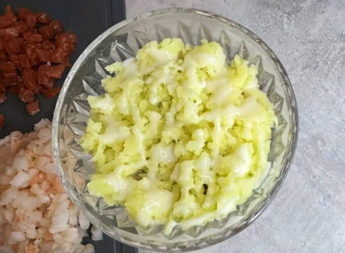 - Fierbeti un cartof mare sau doua mici, si dati pe razatoare. Adaugati in pahar cartoful ras si ungeti cu maioneza.