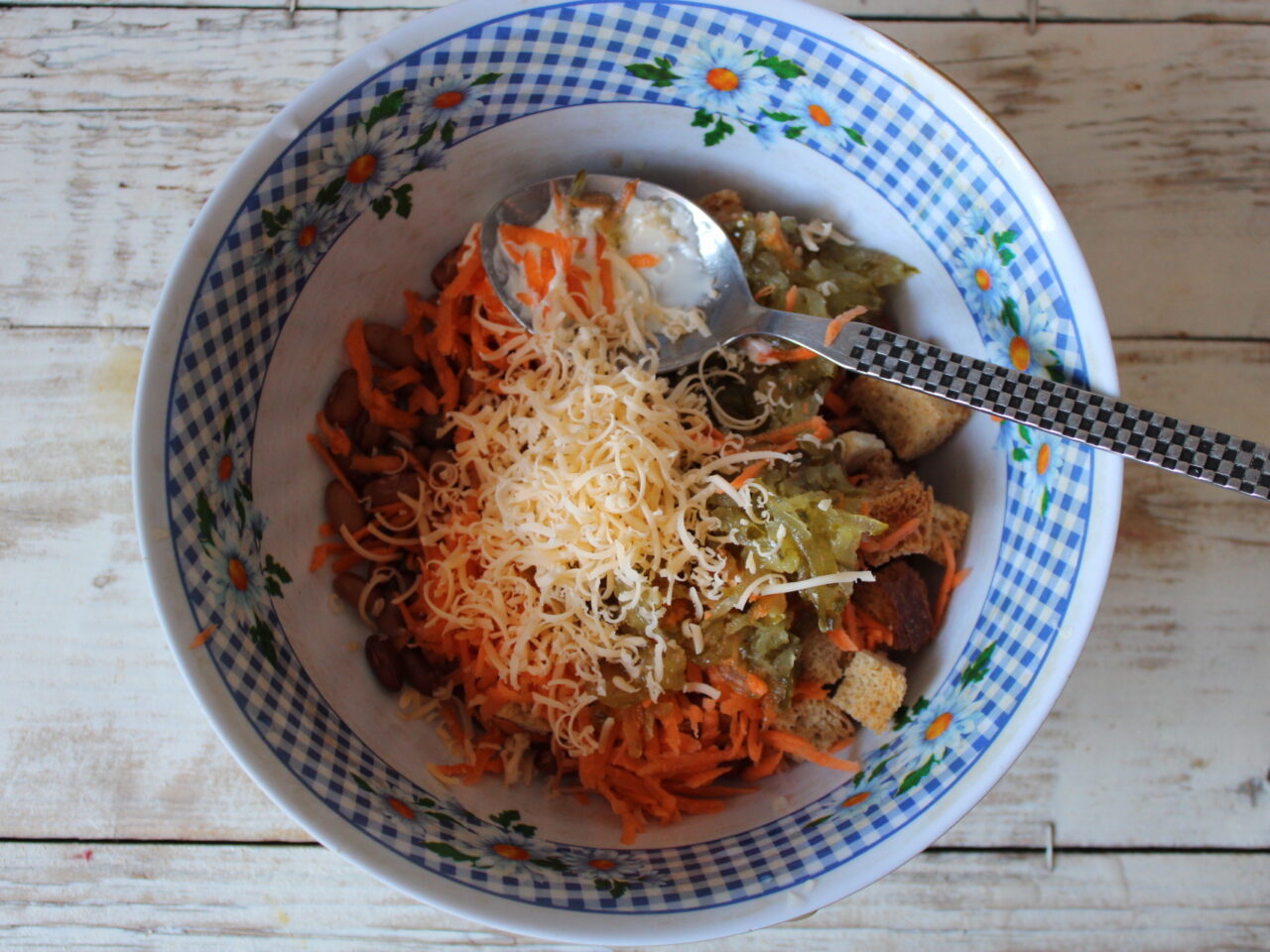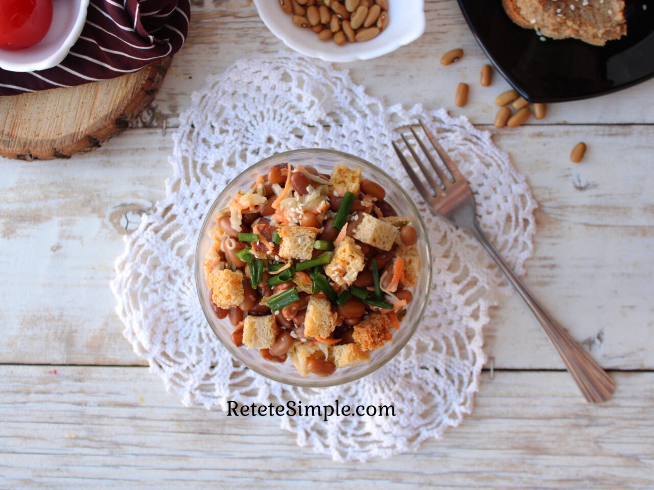 Salata de fasole albă, castraveți murați și cașcaval cu crutoane este perfectă pentru o masă festivă, precum și pentru diversificarea meniului zilnic.
