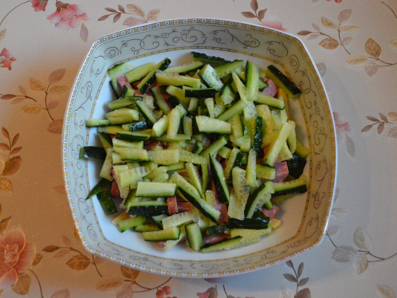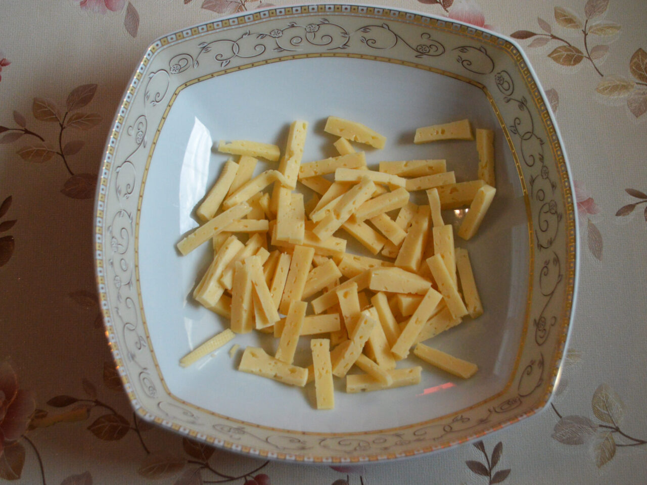- Mai intai pregatiti un bol adanc de salata. Taiati cascavalul in bastonase si transferati-l in bol.