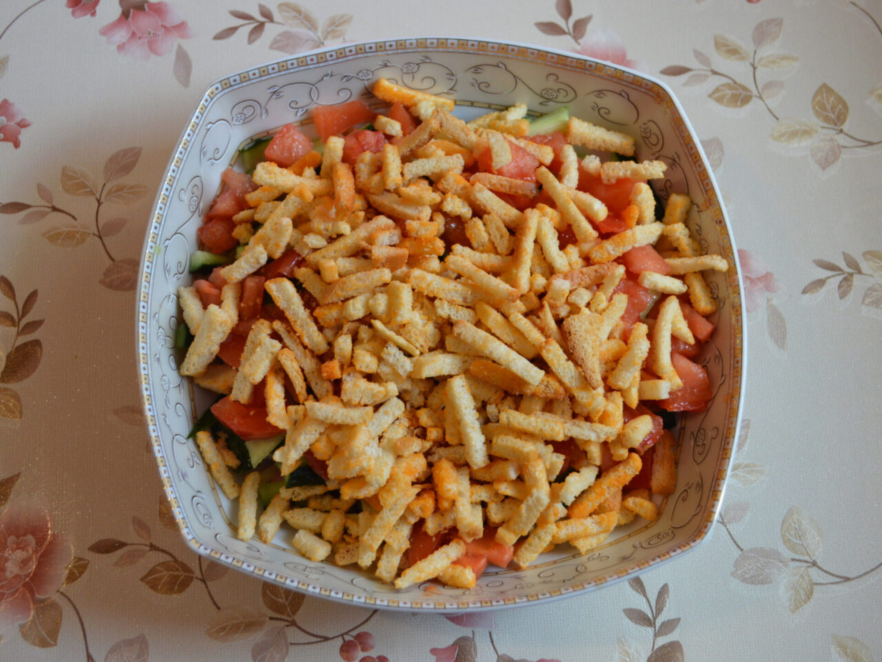 Daca preparati salata pentru o masa festiva care va avea loc peste citeva ore, nu puneti pesmetii deodata, amestecati salata cu maioneza si dati la frigider, iar pesmetii ii adaugati inainte de a pune pe masa salata. Daca e nevoie mai adaugati putina maioneza si amestecati totul bine.