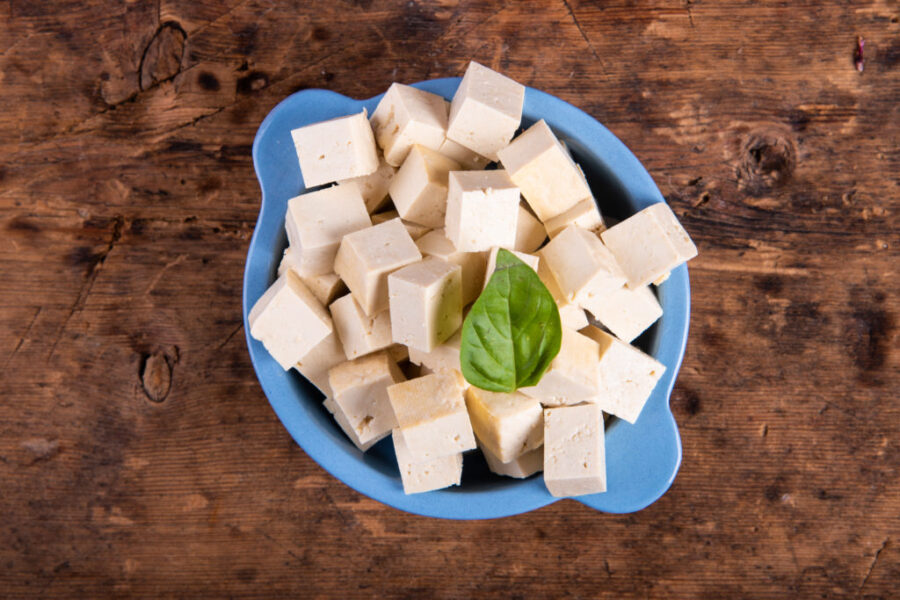- Tăiați tofu-ul în cuburi și prăjiți într-o tigaie până devine crocant.