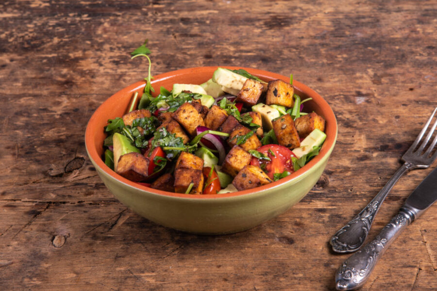 Salata cu tofu prajit si avocado este o alegere inspirata pentru cei care doresc o combinatie de gust, textura si sanatate in aceeasi farfurie. Tofu fraged si crocant se imbina cu cremozitatea avocado-ului, iar legumele proaspete adauga vivacitate. Acest preparat aduce prospețime si satisfacție fara efort, perfect pentru zile active sau momente relaxante. Tofu și avocado sunt produse unice în mod individual, dar împreună sunt un amestec uimitor de substanțe benefice care au un efect pozitiv asupra corpului uman. S-a dovedit că soia și avocado ajută la osteoporoză și problemele articulare.