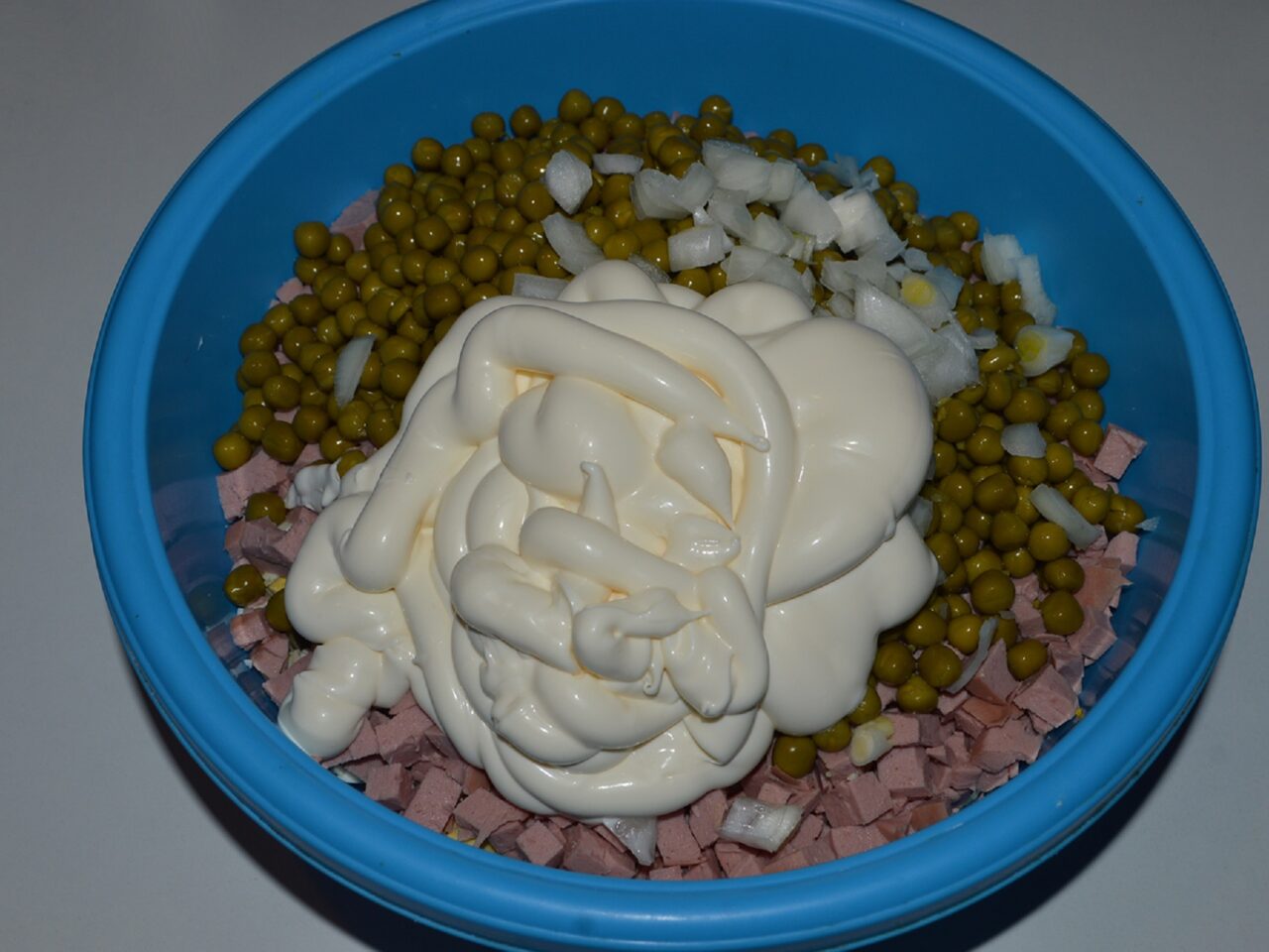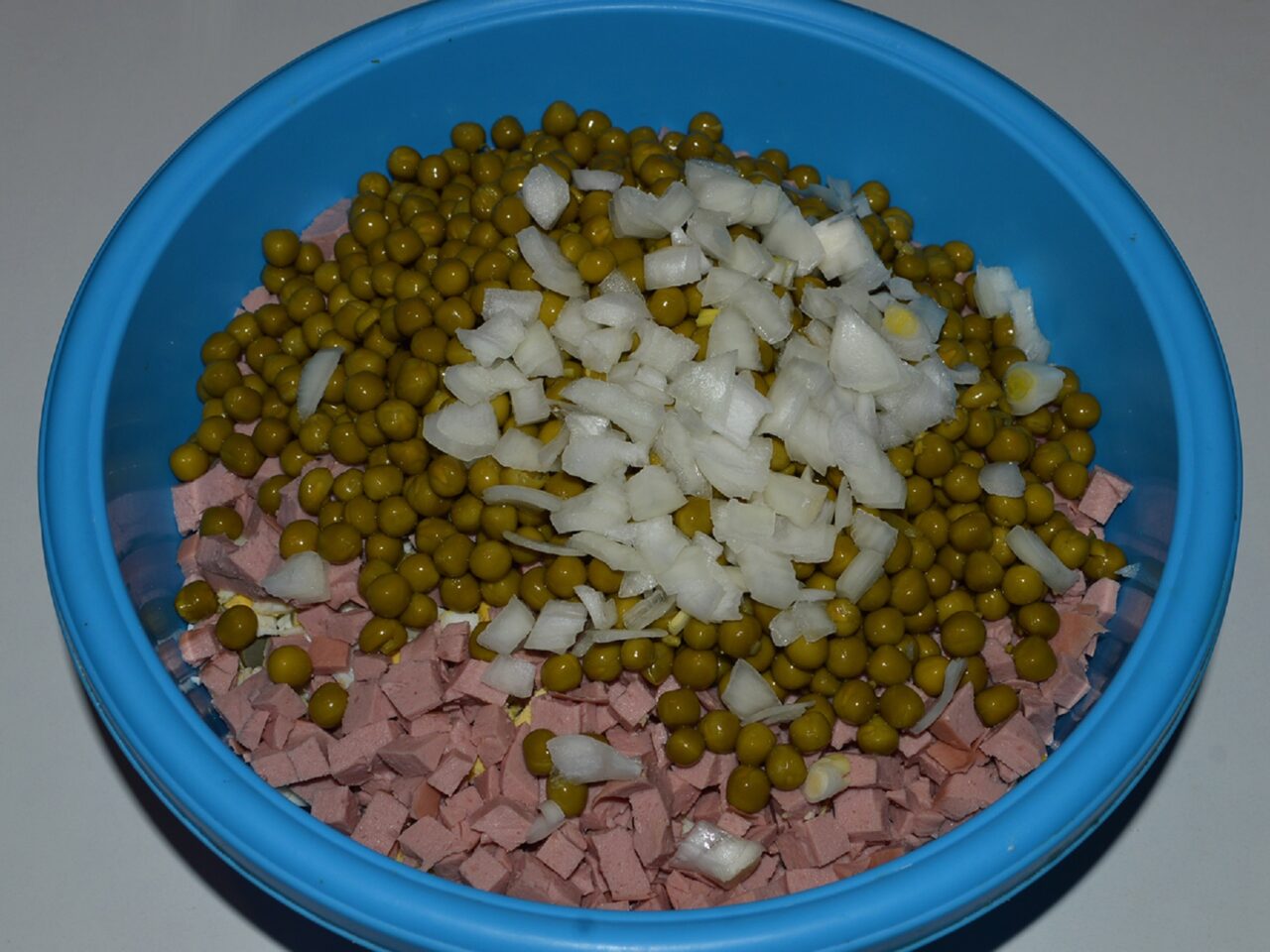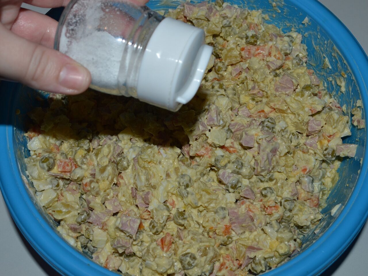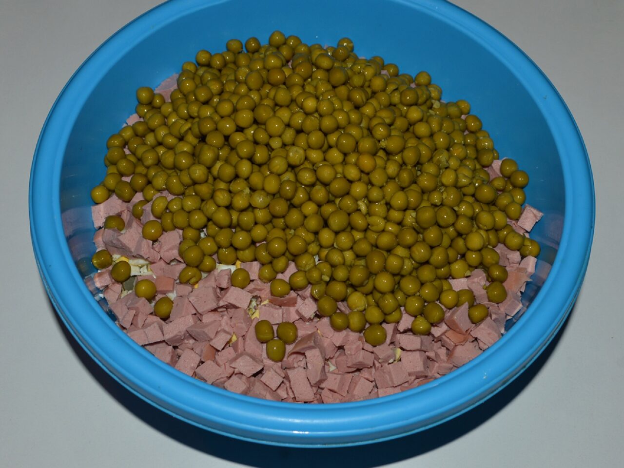 - Scurgeti apa din borcanul cu mazare, clatiti in citeva ape intr-o strecuratoare, apoi adaugati mazarea la salata.