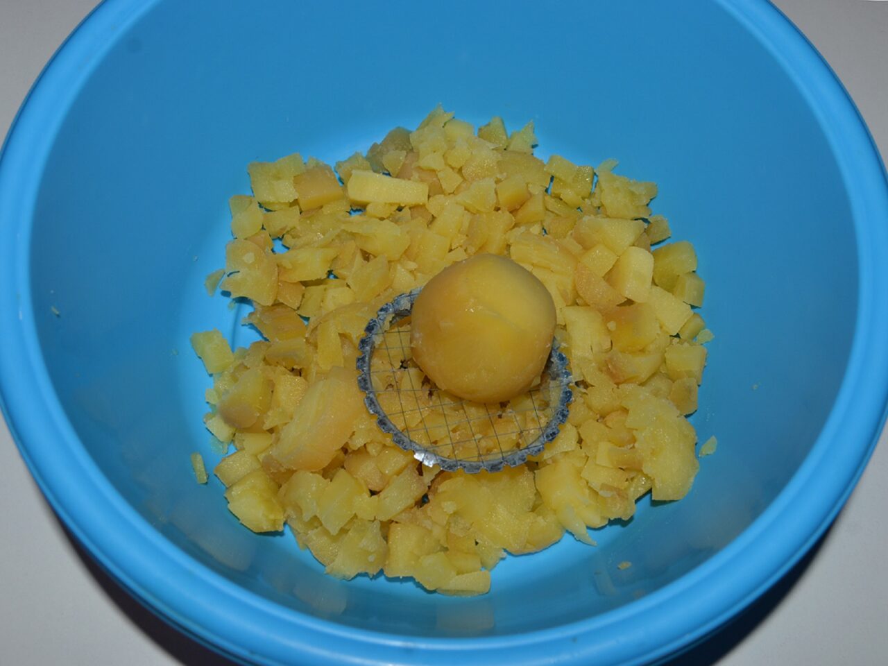 - Pregatiti un bol adanc. Cu ajutorul unui dispozitiv de taiat legume, taiati cartofii. Sau daca nu aveti astfel de dispozitiv, taiati in cubulete mici cu un cutit.