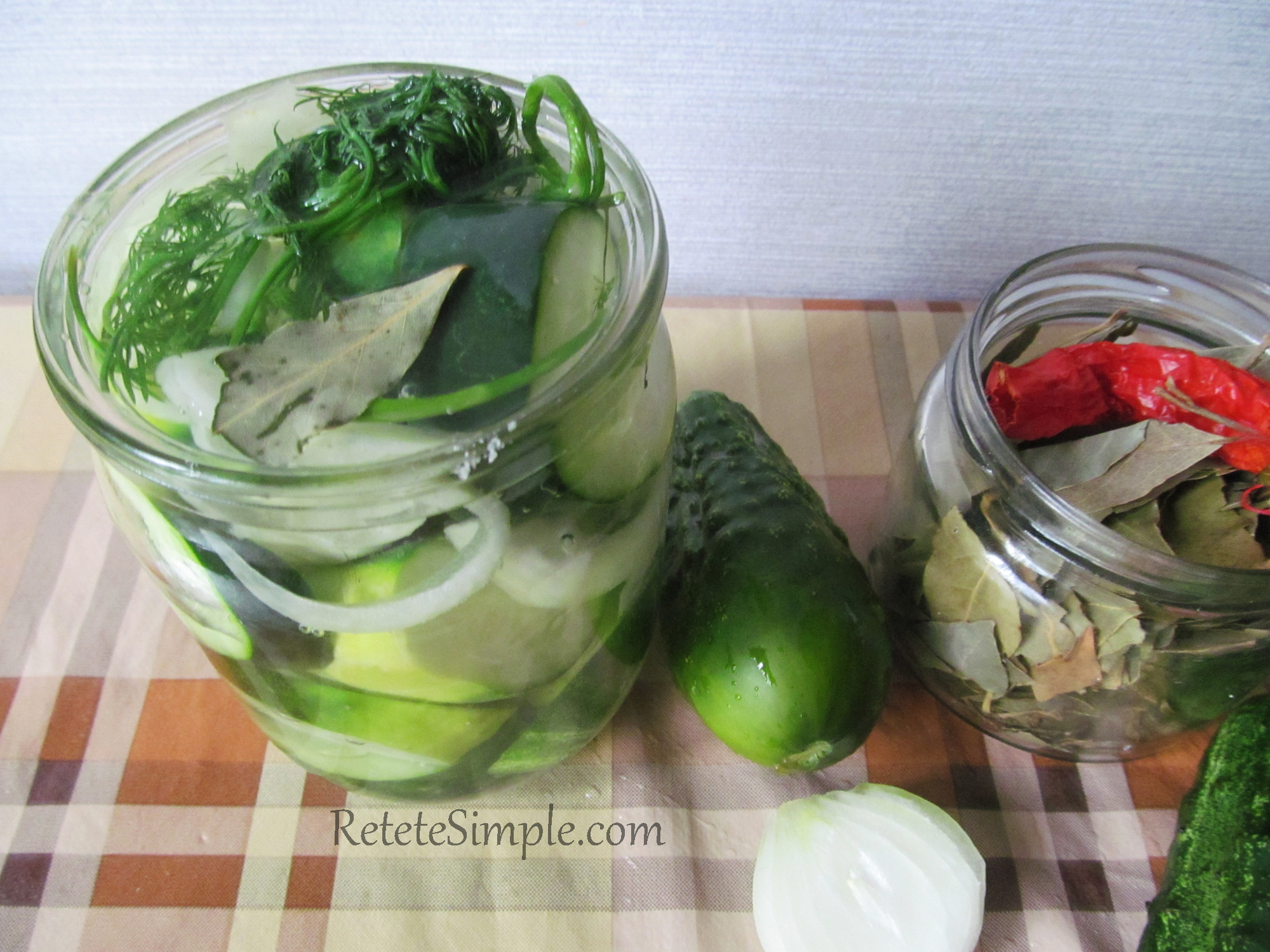 - Puneți condimentele, mărarul, castraveții și ceapa în borcanele pregătite. Puneți 2-3 boabe de piper în fiecare borcan. La câte un borcan de jumătate de litru adăugați un vârf de cuțit de sare, o jumătate de linguriță de zahăr și oțet – 2 linguri, o frunză mică de dafin sau o jumătate de frunză mare.