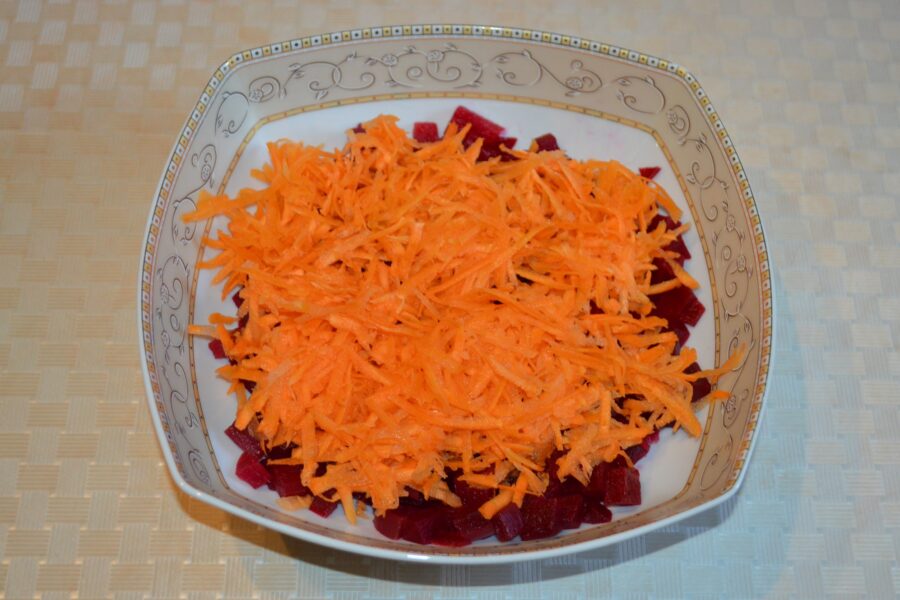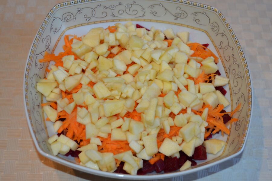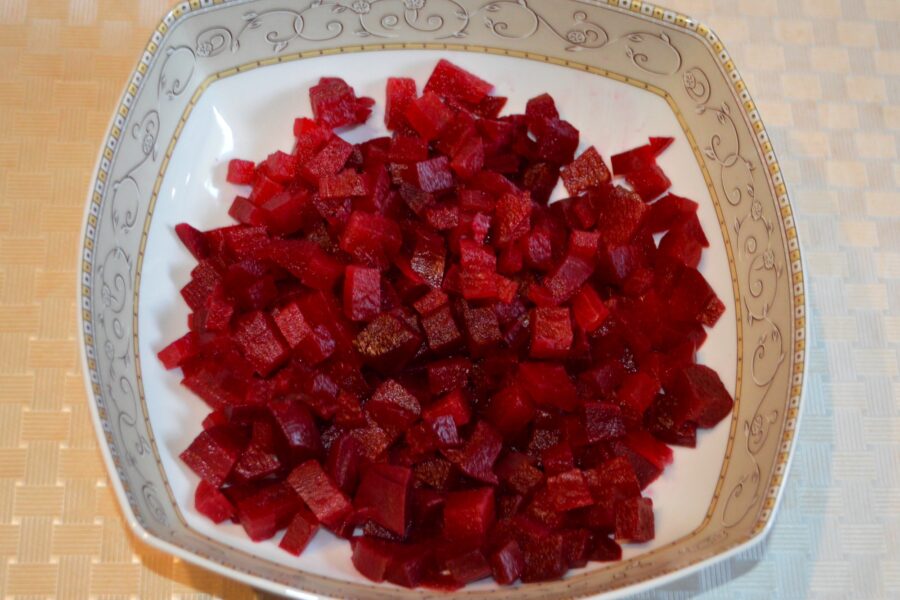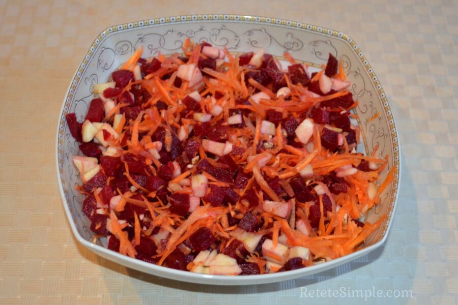 - Fierbeti sfecla cu coaja, o lasati sa se raceasca apoi o curatiti si o taiati cubulete. Adaugati sfecla taiata intr-un bol adanc pentru salata.