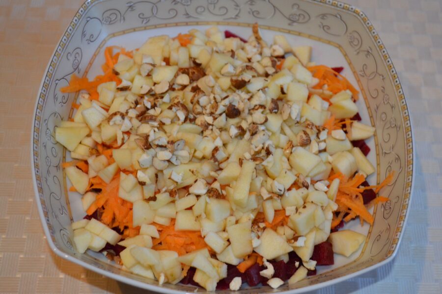 Sfecla este o sursa excelenta de fibre si antioxidanti, iar merele aduc o doza buna de vitamine. Morcovii, la randul lor, sunt bogati in vitamina A si beta-caroten, care sunt esentiali pentru sanatatea ochilor si a pielii. Alunele ofera grasimi sanatoase si proteine, iar toate aceste ingrediente fac salata perfecta pentru o dieta echilibrata si plina de nutrienti.