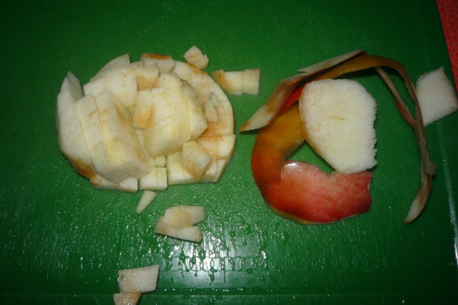 - Și acum mărul. Il curatiti si o il taiati cubulete mici. Dacă serviți salata imediat la masă, atunci tocați mărul și adăugați-l imediat în farfurie. Dacă nu, atunci imediat înainte de servire.