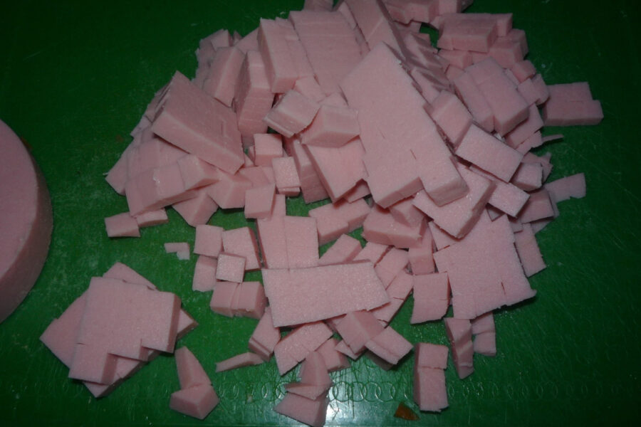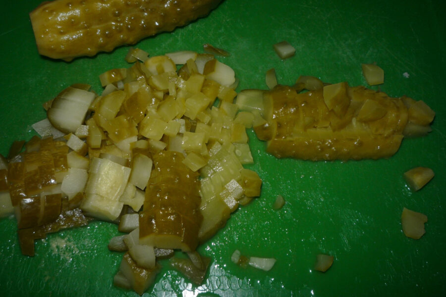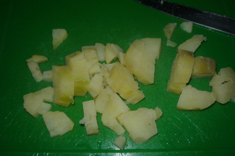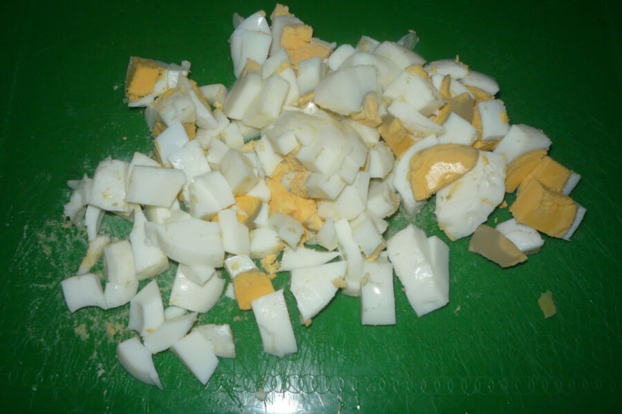 - Scoateți coaja de pe ouă și tocați mărunt.