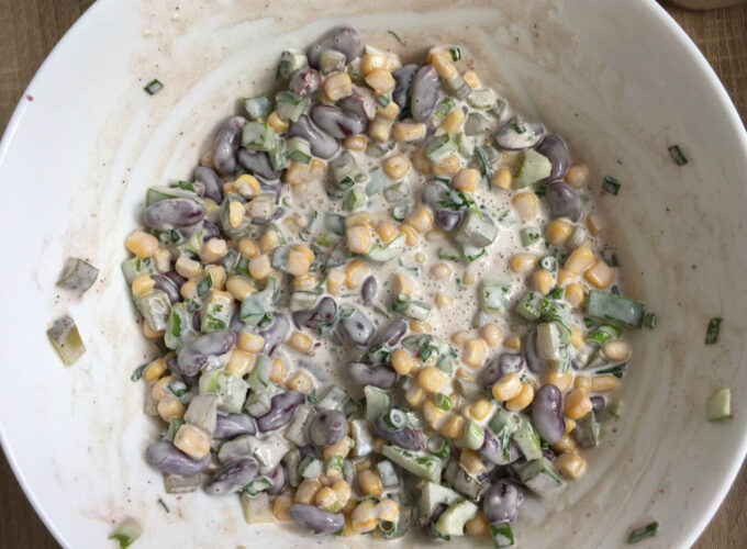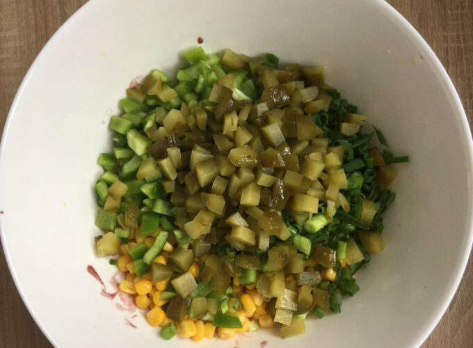 - Tăiați ardeiul și castravetele în cuburi destul de mici, tăiați ceapa. Puneti fasolea scursă și porumbul într-un castron mare.