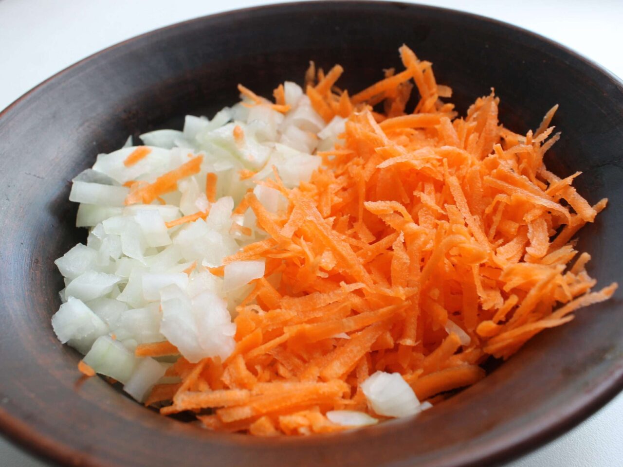 - Procesul merge în mai multe direcții. Mai întâi pregătesc totul pentru carnea tocată. Tocam ceapa marunt. Se rade morcovii pe răzătoarea medie.