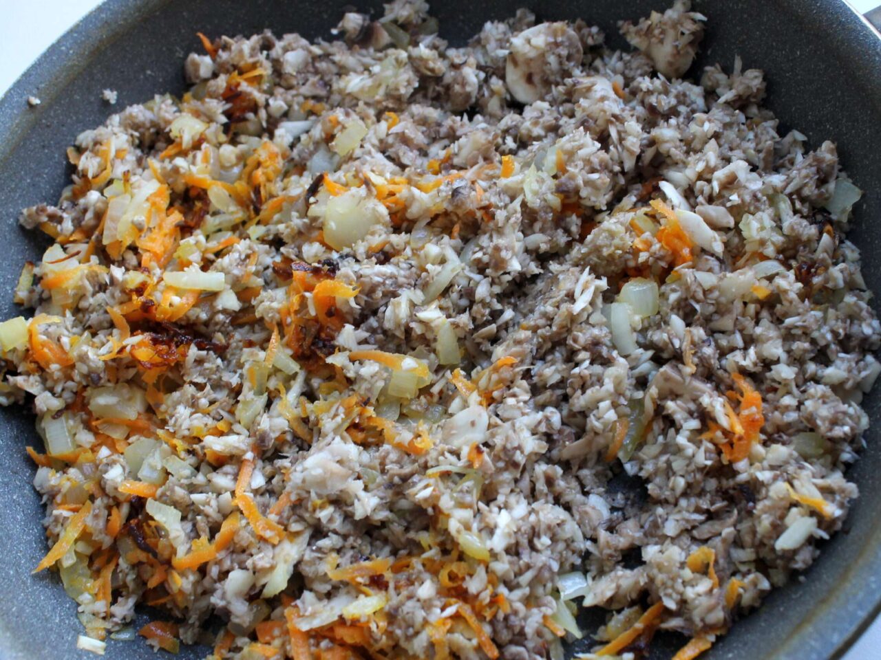 - In timp ce aceasta bucata se prajeste la foc mediu in ulei incins intr-o tigaie, se toaca ciupercile. Le puteți toca mărunt, dar am decis să le trec prin blender. Apropo: această metodă de tocare va face umplutura mai densă și nu se va sfărâma.