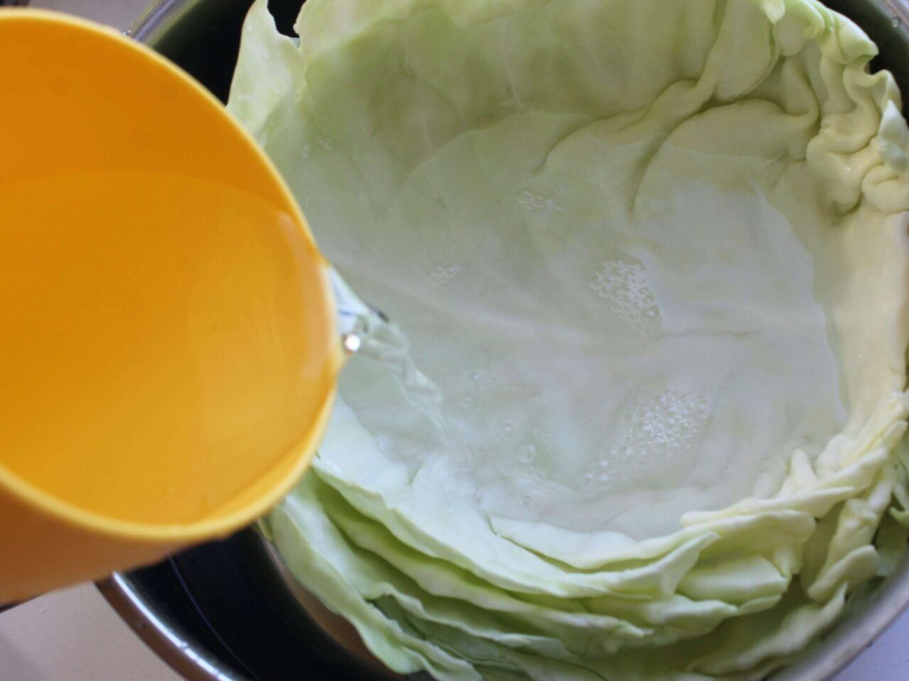 - Totodata am pus si o cratita cu frunze de varza umplute cu apa. Lasă-le să se gătească până sunt fierte pe jumătate. Important: este mai bine să întoarceți frunzele periodic, astfel încât toate părțile lor să fie gătite uniform.