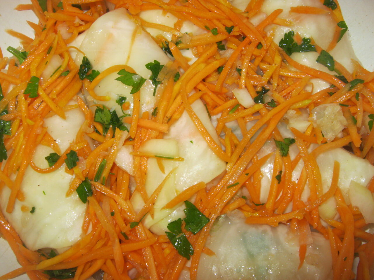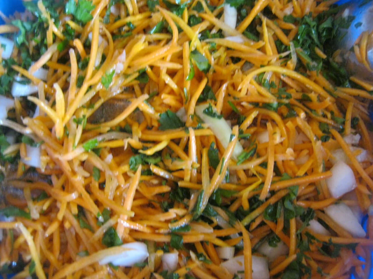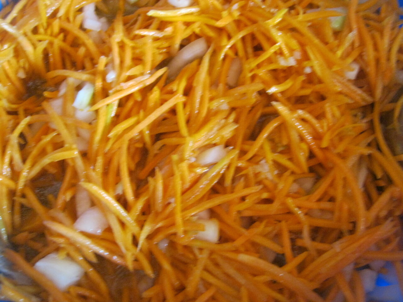 - Se scaldă varza cu apă clocotită și se desface în frunze. Se rade morcovii cu o răzătoare coreeană pentru morcovi.