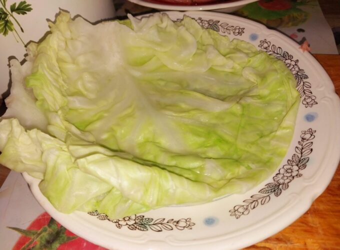 - Puneți ușor varza în apa clocotită. Se înmoaie cu o furculiță. Și așteptați aproximativ cinci minute. Apoi, cu o furculiță scoatem frunzele de sus și le punem într-o farfurie. Și așa toate celelalte la fiecare cinci minute. Frunzele trebuie să fie ușor moi, dar nu fierte. Frunzele prea fierte se pot separa atunci când sunt rulate. Pentru varza tânără, 2 minute sunt suficiente.