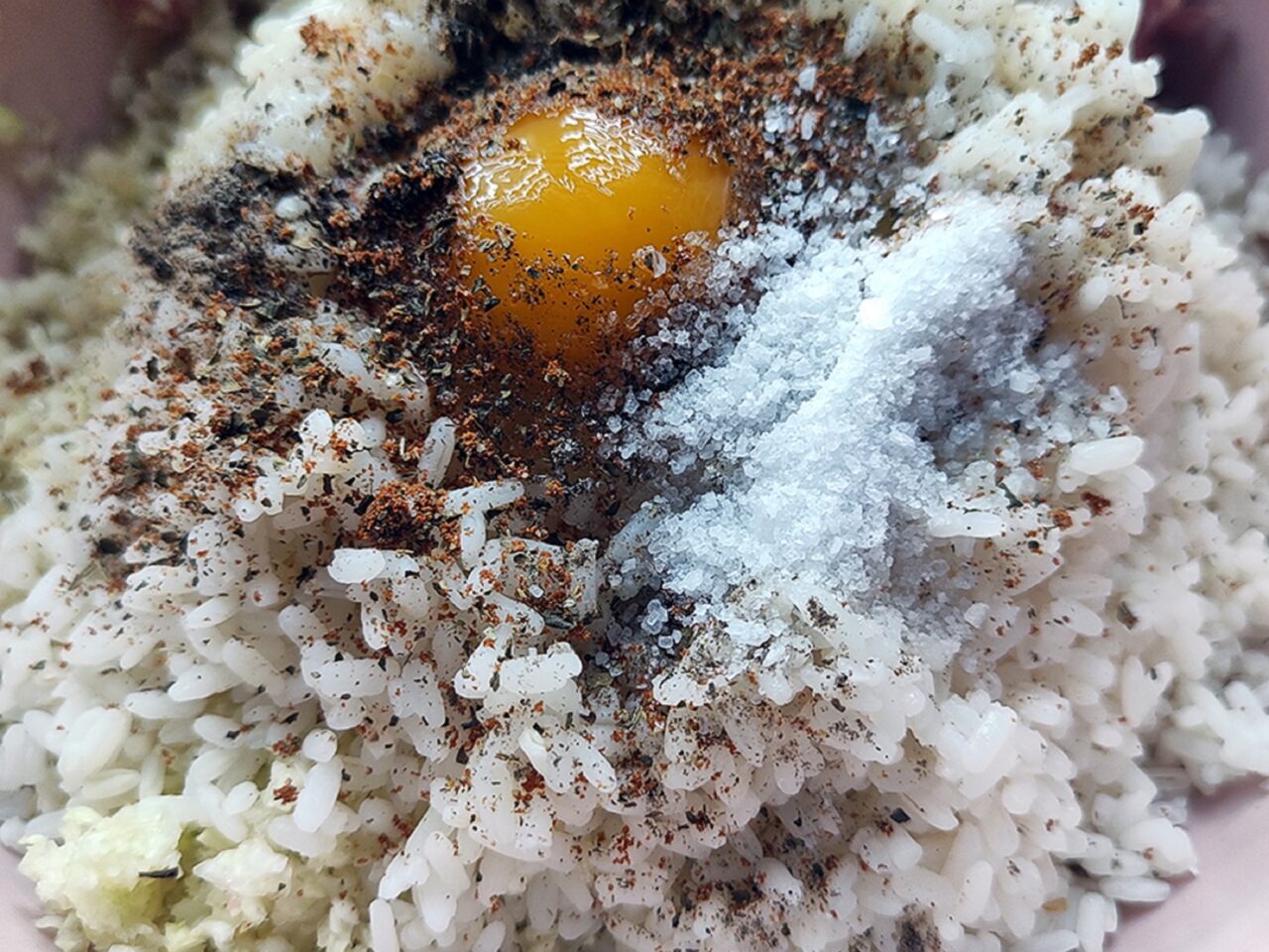 - Adăugăm orezul fiert, oul, condimentele (în cazul meu, boia și piper negru).