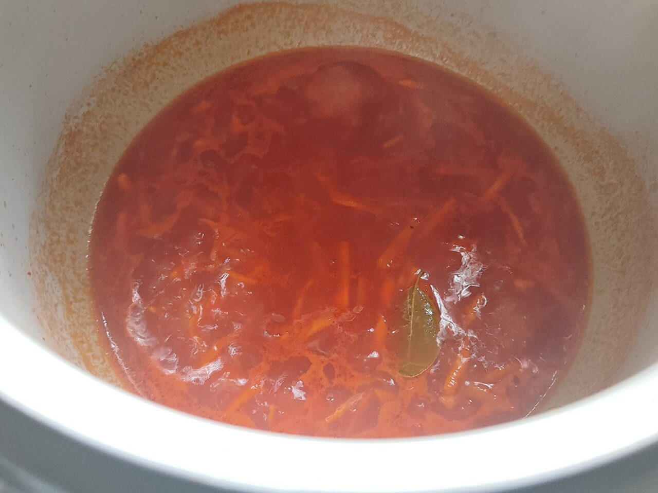 - Adăugăm în vas condimente, sare, zahăr, frunze de dafin și prăjim pentru a elibera aroma condimentelor. Oprim focul. Turnăm un pahar de apă.