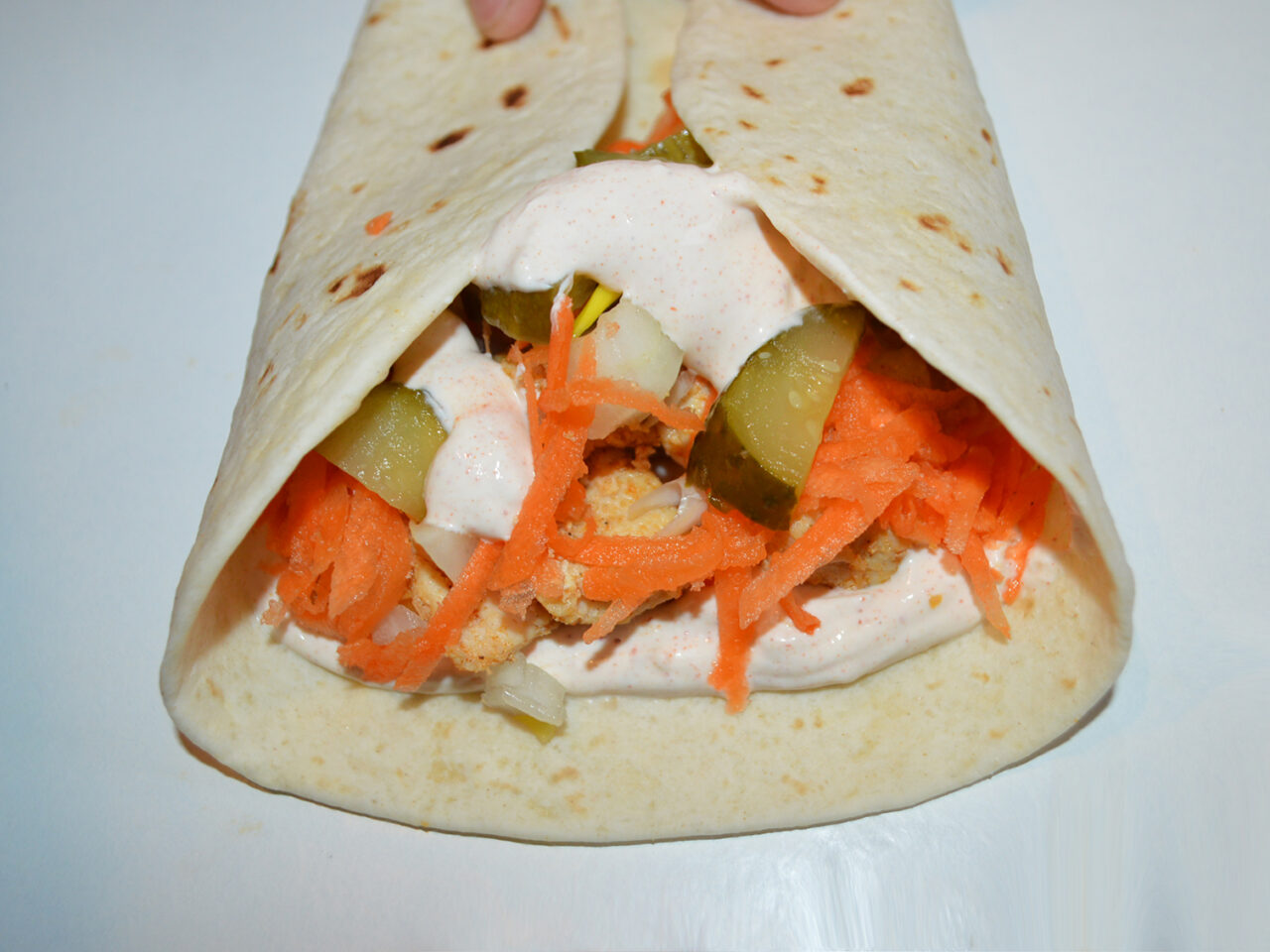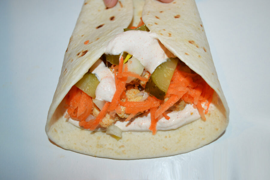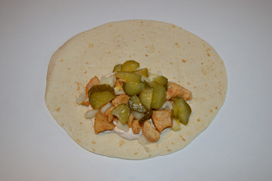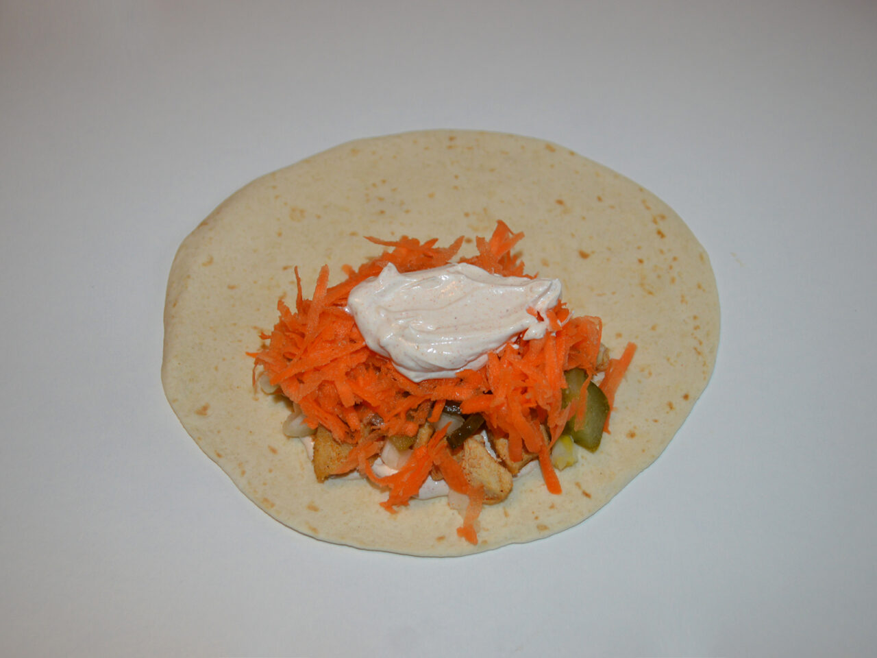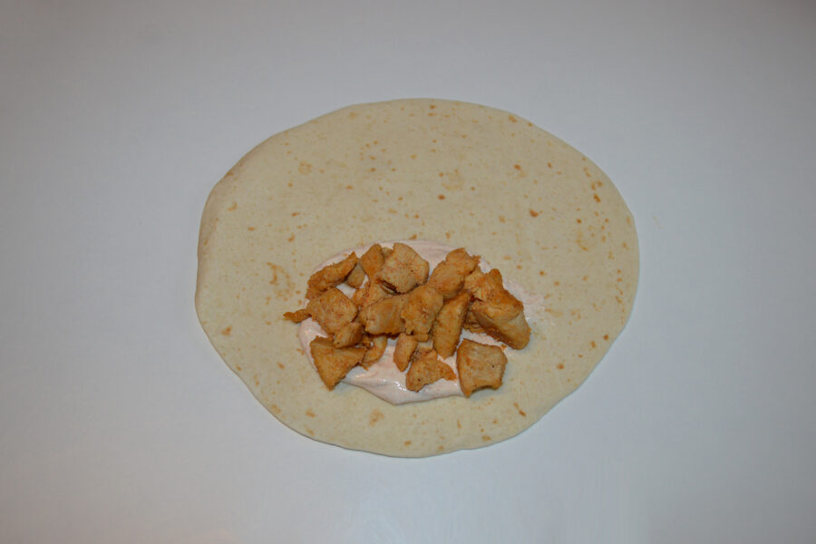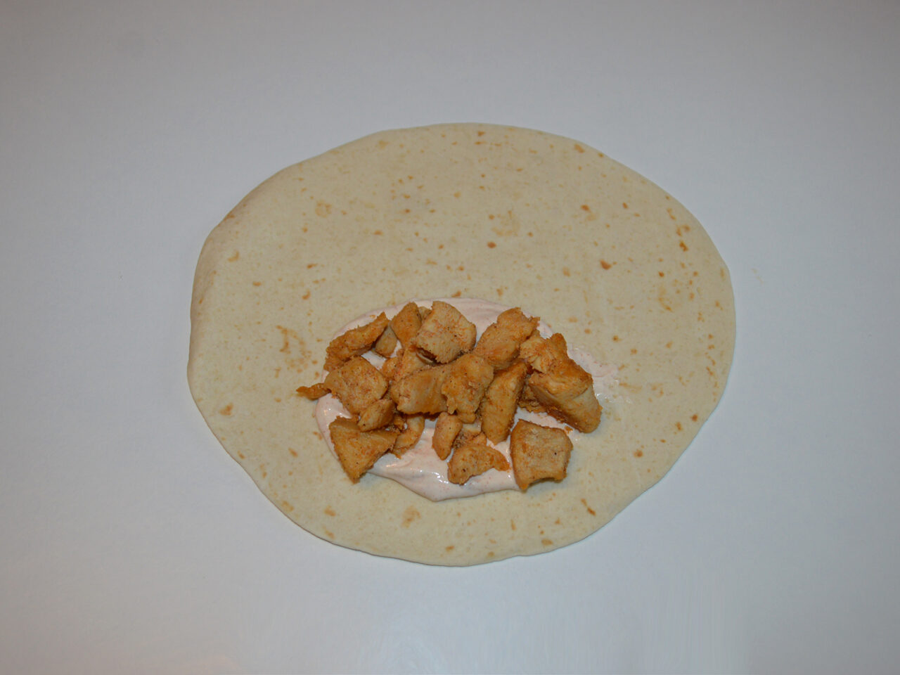 - Pe o tortilla puneti putin sos intr-o margine, apoi deasupra puneti piept de pui.