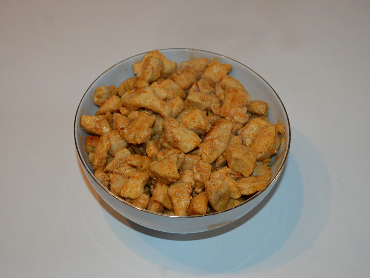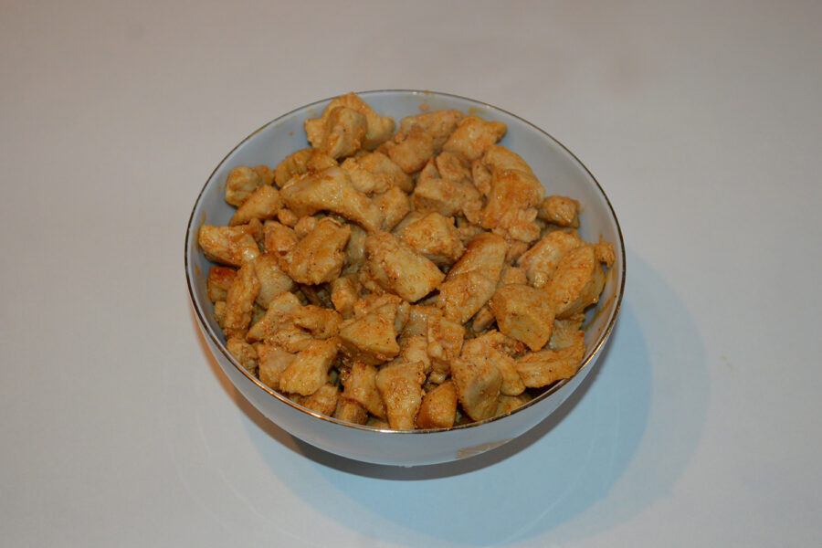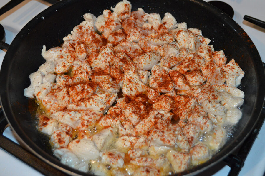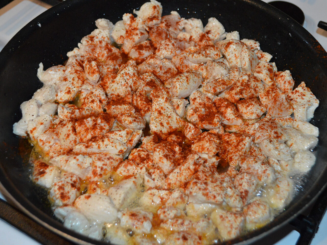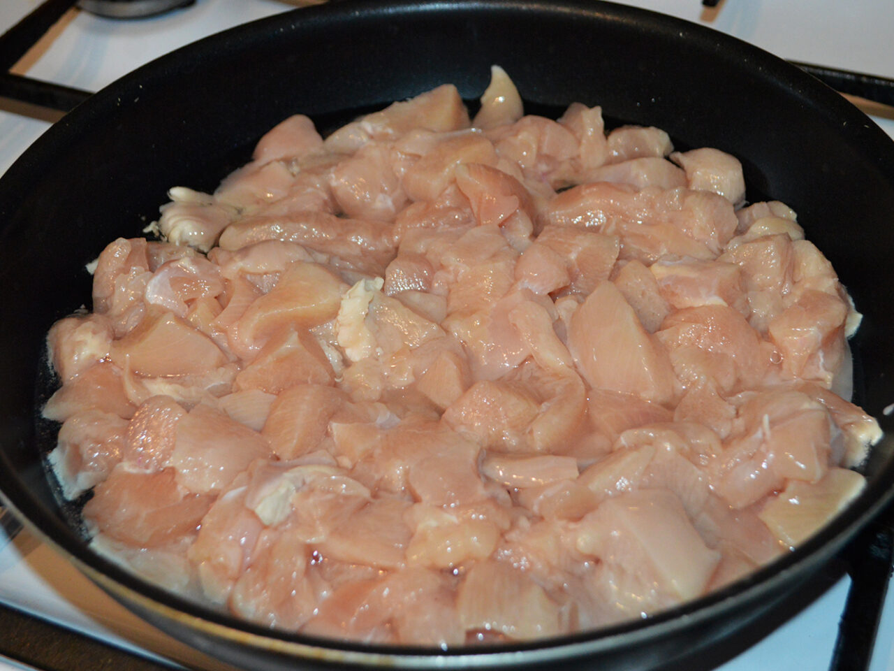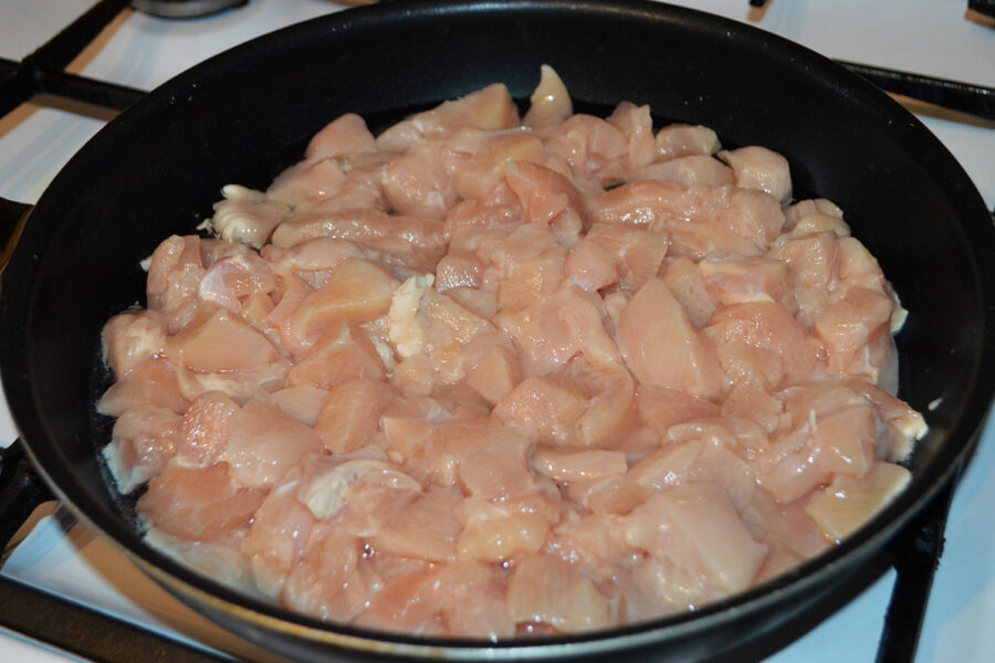 - Taiati pieptul de pui si puneti-l la prajit intr-o tigaie cu putin ulei.