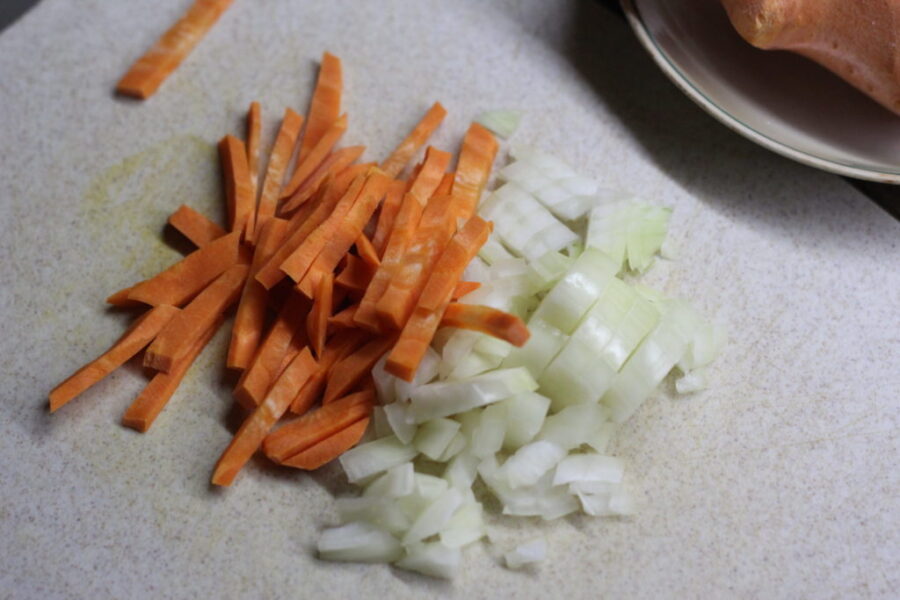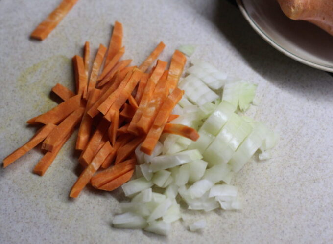 - În primul rând, tăiați morcovii curățați fâșii și tăiați ceapa în cuburi. Sotește ingredientele într-o cratiță în ulei rafinat până la o nuanță aurie plăcută.