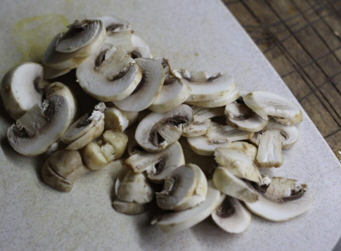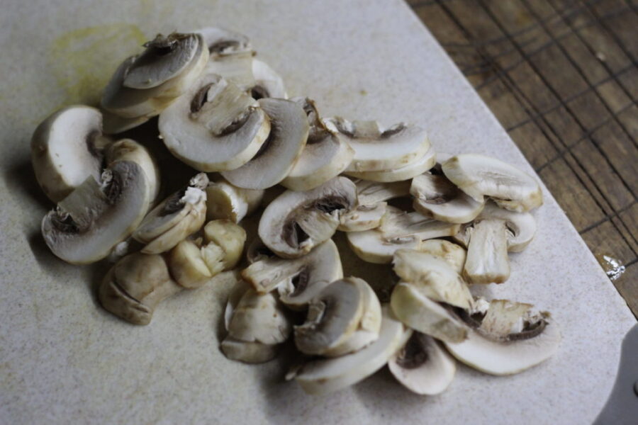 - Tăiați șampioanele în felii mari. Adăugați ciupercile în legumele sotate și căliți câteva minute.