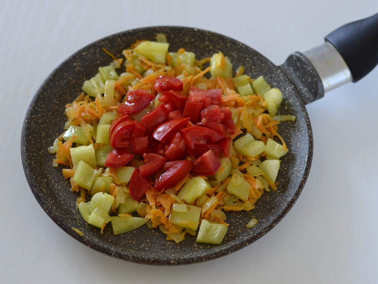 - Se adaugă roșiile tocate și se mai gătește 1-2 minute.