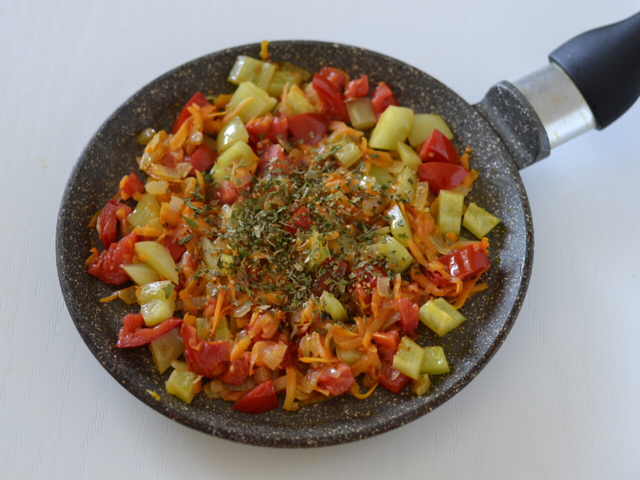 - Se adaugă legumele călite în cratiță și se amestecă.