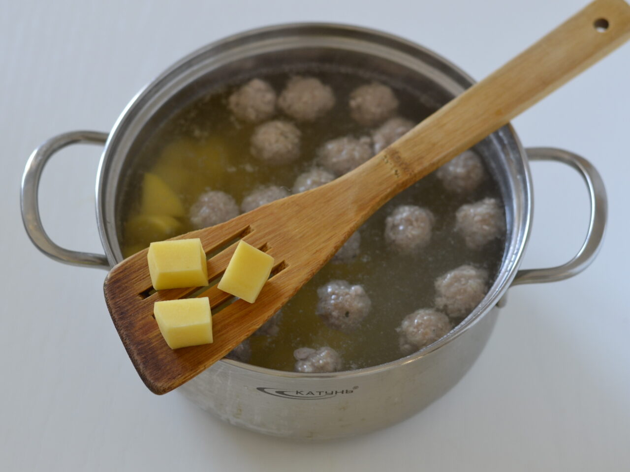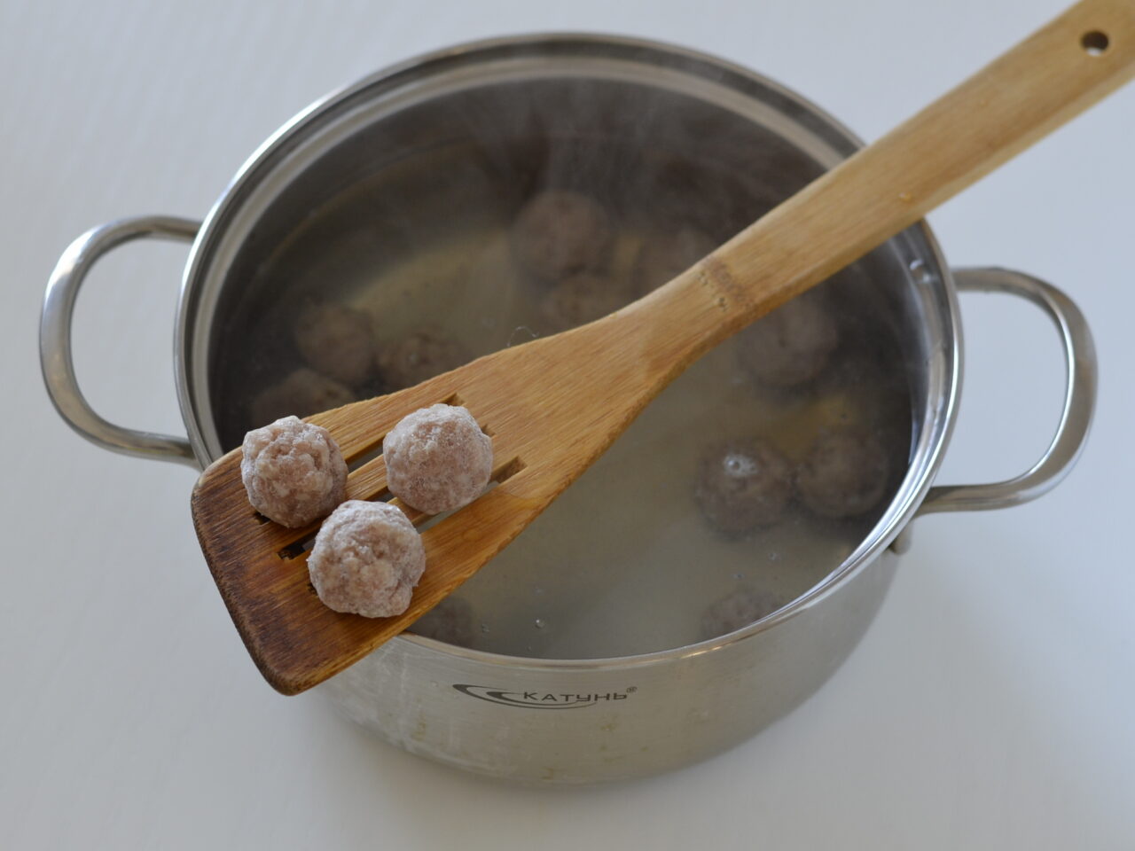 - Cu mâinile umede, se formează mici chifteluțe din carnea tocată, se introduc în apă clocotită sărată, se reduce focul la mediu și se fierb timp de aproximativ 10 minute.