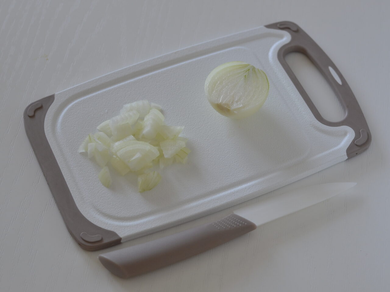 - Se curăță ceapa de coajă și se taie în jumătăți de inele subțiri.