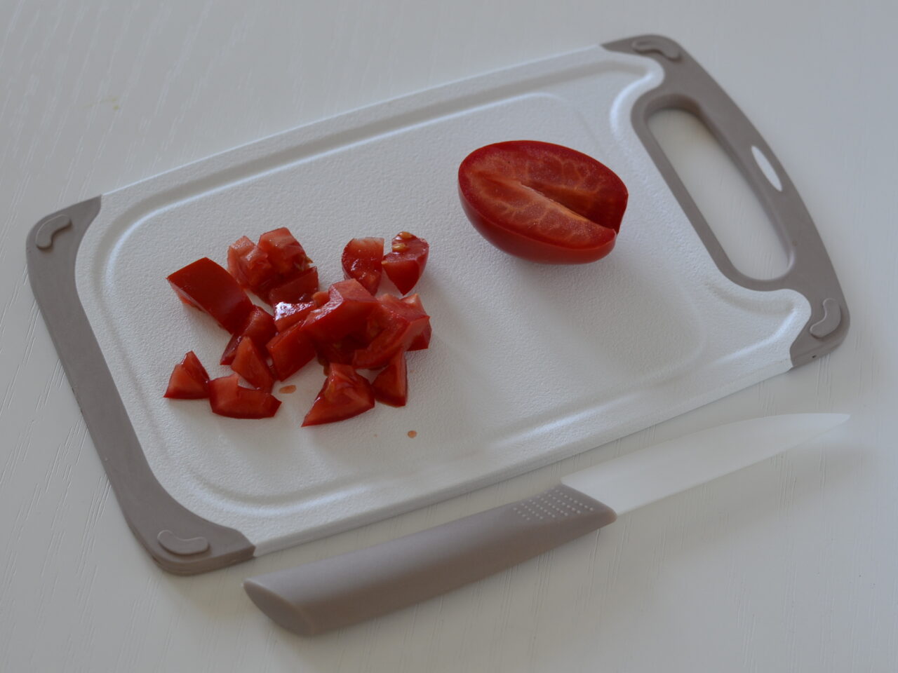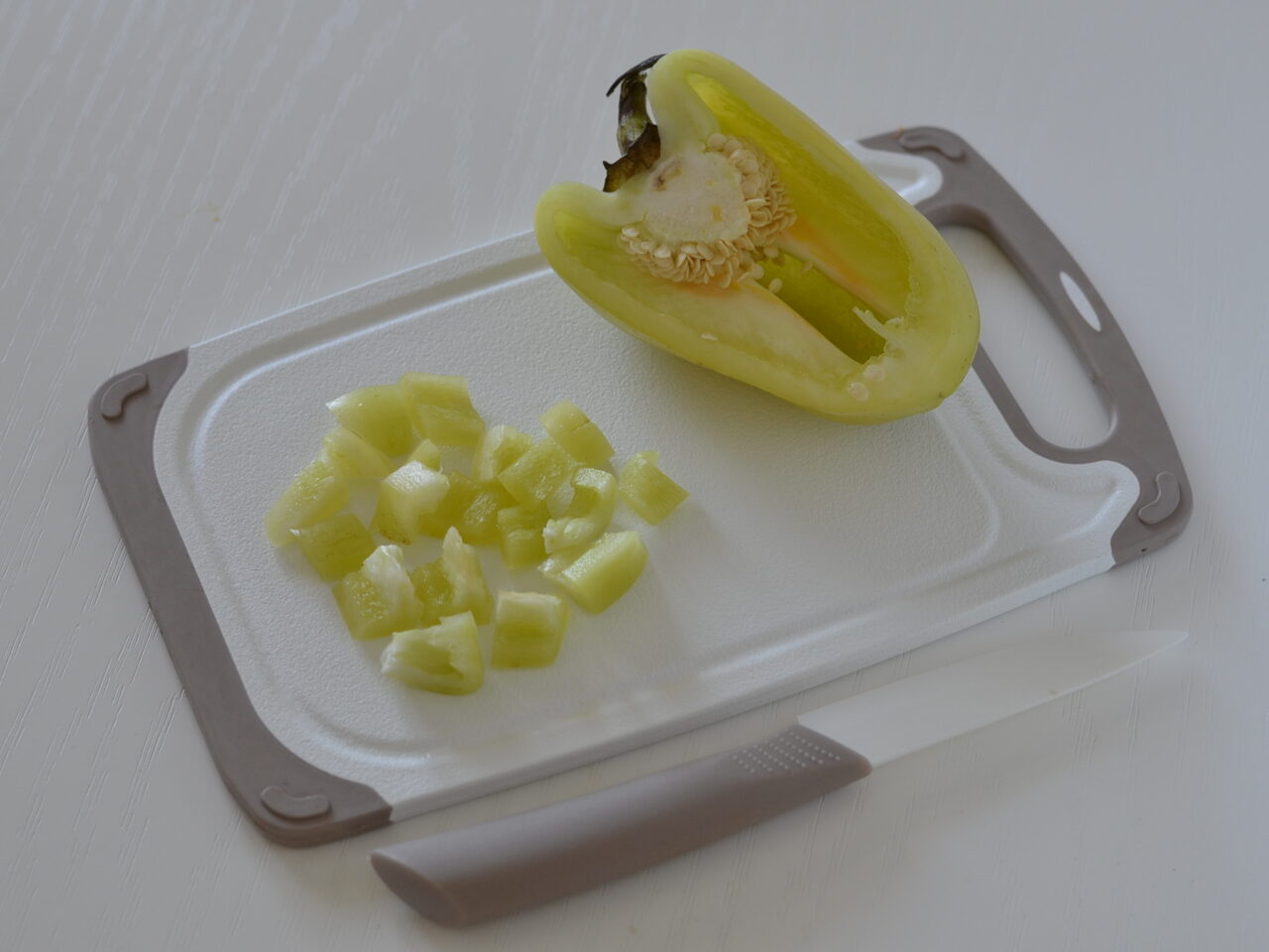 - Se spală ardeiul gras, se îndepărtează semințele și pielița, apoi se taie în cuburi mici.
