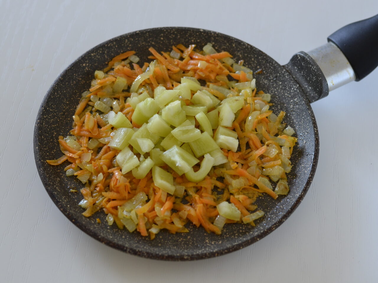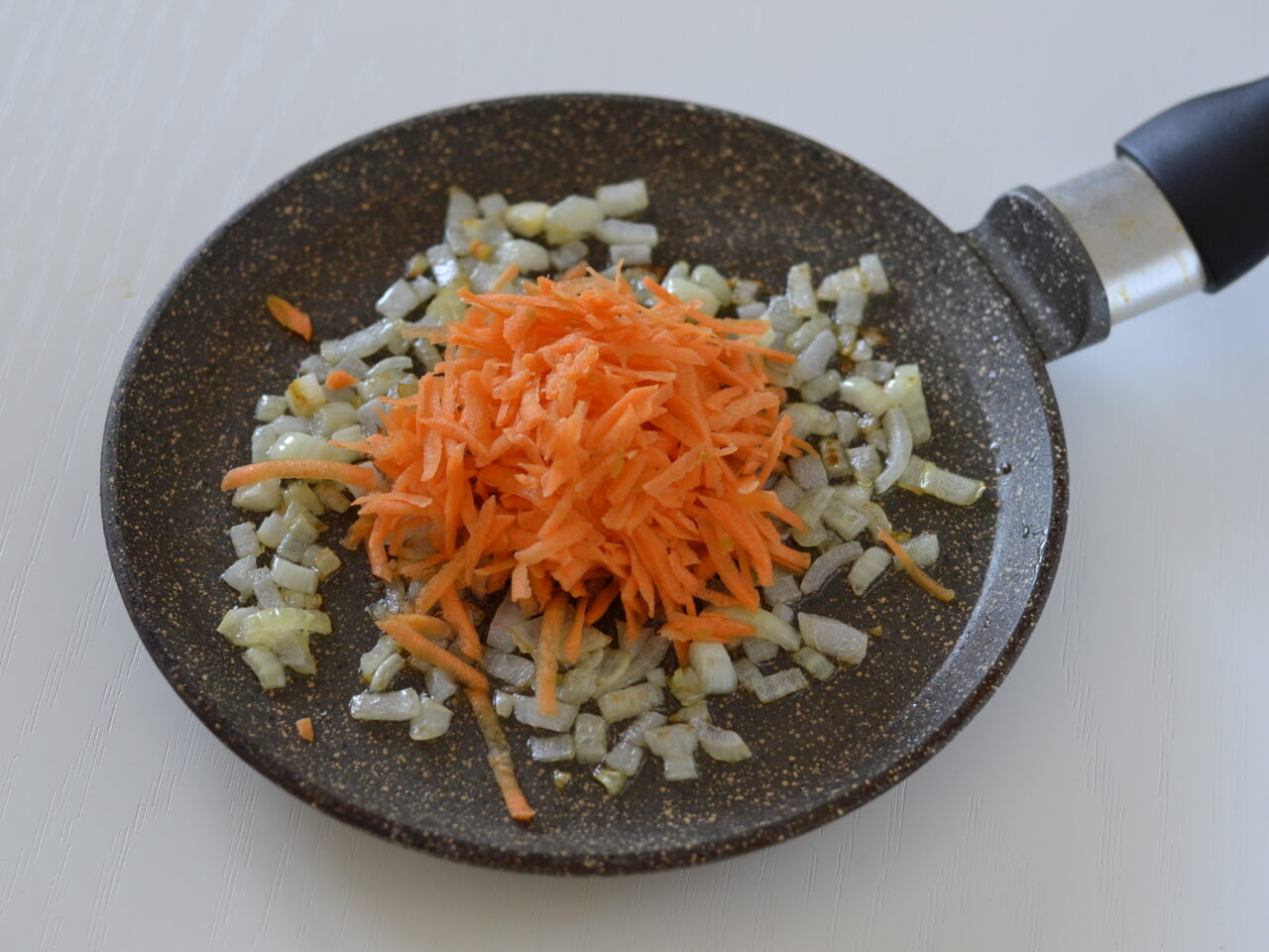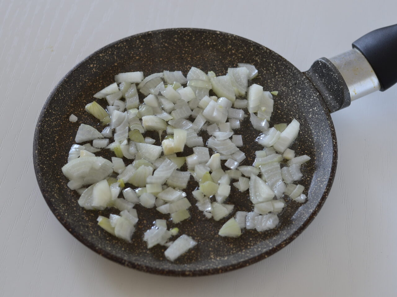 - Ceapa tocată se pune într-o tigaie, și se prăjește în ulei, până se rumenește ușor și devine moale.
